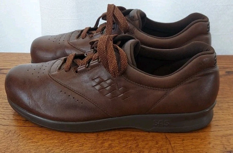 These are SAS Free Time Women's walking shoes in a teak brown color. They feature a solid pattern, round toe shape, lace-up closure, and low heel height. Made of leather with a polyurethane outsole, they offer maximum cushioning and arch support. These comfortable shoes are suitable for travel, activewear, casual, and workwear occasions. The shoes have a removable insole, which have been removed. Buyer can use their own insoles or purchase insoles from SAS website. Handmade in the United States, they are designed for walking activities. *Slight/minimal scratching in leather as shown in photos, extra padding added by previous owner-price reflects this*