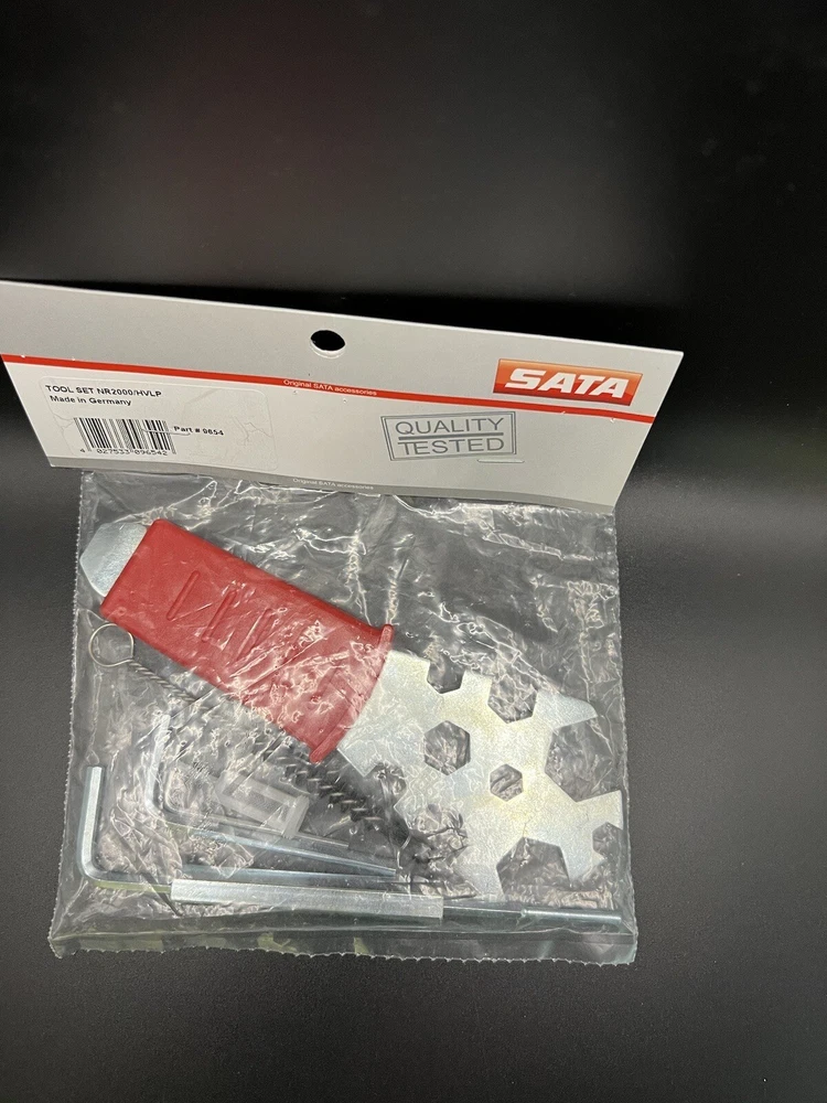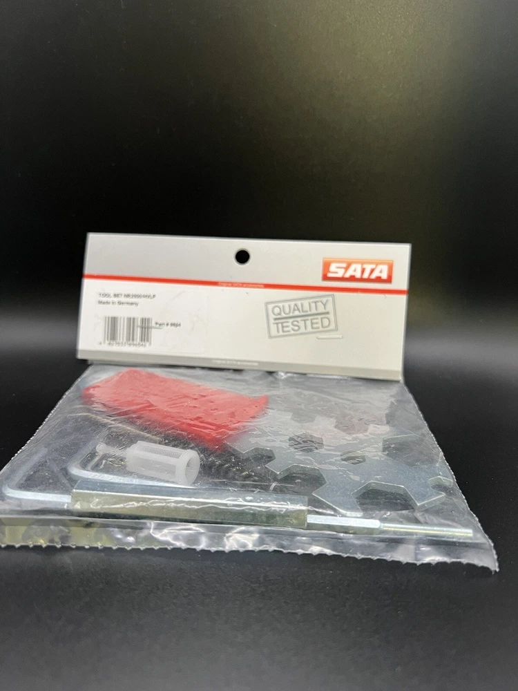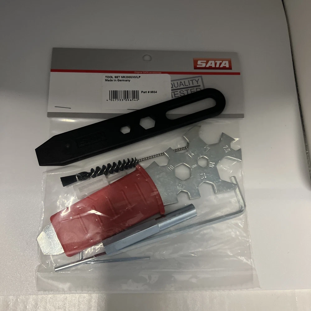 Accessories: Factory Tool Kit Air Inlet Size: N/A Non-Domestic Product: Yes Warranty: No Warranty Country/Region of Manufacture: Germany UPC: Not Applicable Set or Single Item: Set Type: Air Spray Gun Manufacturer Part Number: 9654 gtin13: Not Applicable Hopper Size: N/A Brand: SATA Features: Tool Kit Modified Item: No Custom Bundle: No