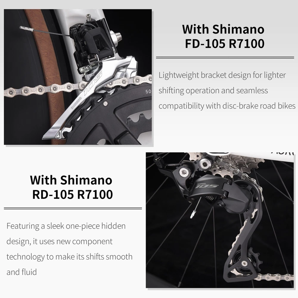UCI Certificated Carbon Frame The frame has been certified by the UCI and is authorized to participate in any UCI-organized event. shimano 105 ST-R7120 With the mechanical 12-speed components of the 105 series, offers a shifting system for the most diverse types of road cyclists. the ST-R7120 shift/brake levers are not only characterized by the fast and intuitive shifting quality typical of the series, but also know how to convince on an ergonomic level thanks to improved grip and optimized comfort features. shimano 105 FD-R7100 Front Derailleur - 2x12-speed With the mechanical 12-speed components of the 105 series, The FD-R7100 front derailleur is characterized not only by a light, harmonious and at the same time natural shifting behavior, but also impresses with its simple and precise adjustability. shimano 105 BR-R7170 disc brake caliper The hydraulic Shimano BR-R7170 brakes, athletes can test their limits even further. A 10 % larger pad spacing compared to the previous model reduces the risk of unwanted brake friction and grinding brake discs. This reduces overall noise during deceleration, the BR-R7170 calipers not only grip quickly, but also reliably. With 11-32T Cassette With a gear ratio range of 327 %, the 11-32T cassette is optimally equipped for the most diverse terrain requirements. Whether sprints on the flat or steep climbs, with a gradation of 11 to 32 teeth, the 12-speed sprocket set has the right answer for every situation. shimano 105 RD-R7100 Rear Derailleur - Shadow RD | 12-speed With the mechanical 12-speed components of the 105 series. The RD-R7100 rear derailleur combines the harmonious, consistent and nevertheless responsive shifting behavior of the Shadow RD design with Direct Mount compatibility and a wider ratio range, the Top Normal rear derailleur also enables energy-saving transmission with a ratio of less than 1:1, which is ideal for climbing and supports the rider when climbing even steep ramps. Bicycle specification Bike Type: R08-R7120-24S Wheel Size: 700C Frame Size: 47cm/51cm/54cm/56cm Bicycle net weight :8.8kg (pedals not including) Frame material: T800 Carbon fiber Fork: T800 Carbon Fiber Handlebar: T800 Carbon fiber, 400mm x 31.8 mm Shift Lever: SHIMANO, ST-R7120 Front Derailleur: SHIMANO, 105 FD-R7100 Rear Derailleur: SHIMANO, 105 RD-R7100 Crank set: PROWHEEL , 34/50T*170MM Freewheel: SUNRISE 11-32T , Cassette Brake caliper: SHIMANO ,BR-R7170 Brake rotor: IIIPRO Centeral lock Pedal SANYUN :LP-B921 Chain: YBN 12S 1/2"x11/128" Saddle: YBT, PU leather Seat post: T800 Carbon fiber 350mm Wheels: Carbon fibre , 50MM Front hub:M12*100mm, 14G*28H