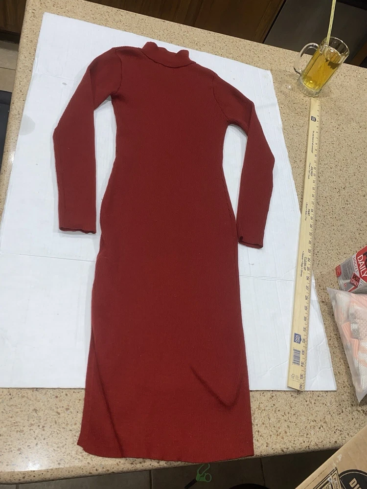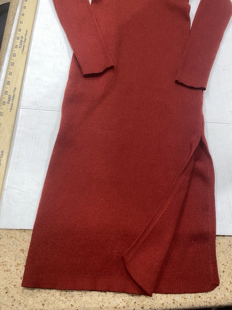 Pre owned body con deep red sweater dress. Brand is Say What? Turtleneck with open chest and 2 rings. Please review all pictures and ask any questions prior to purchase.