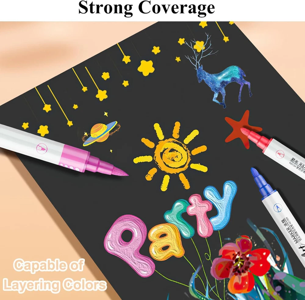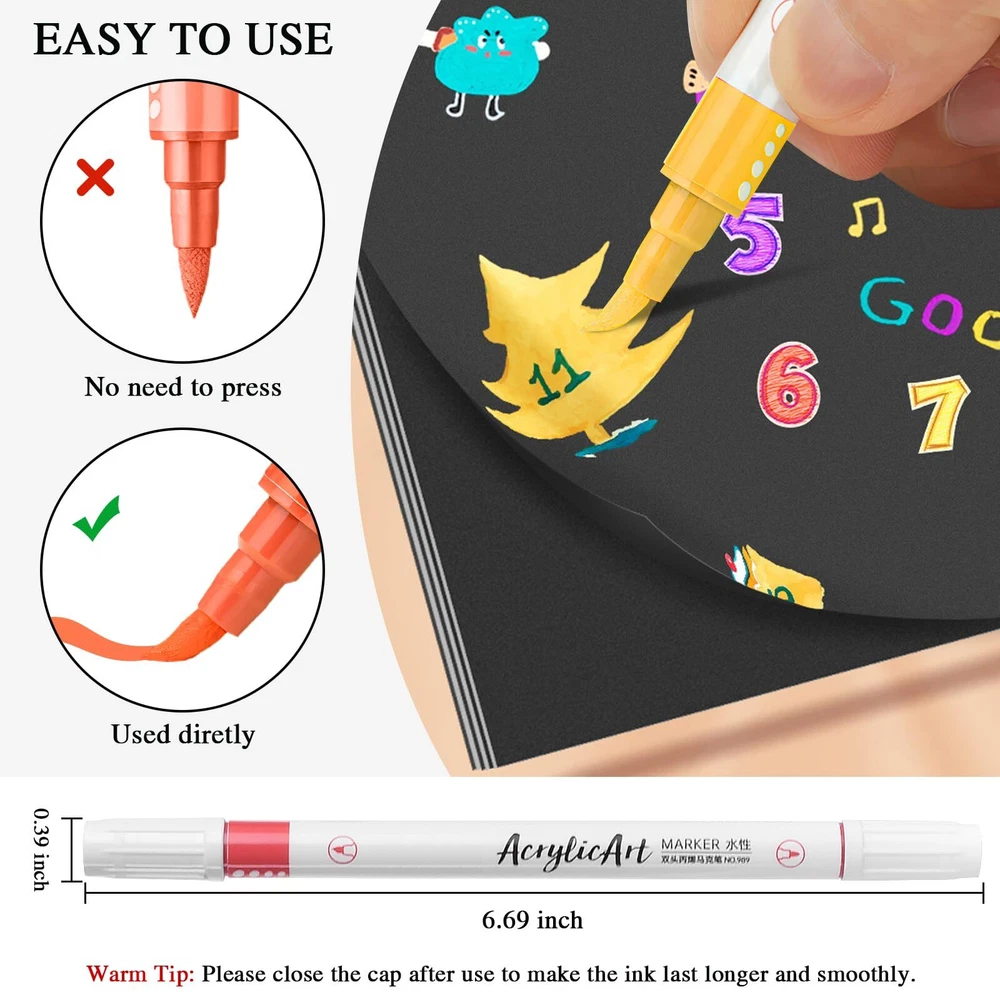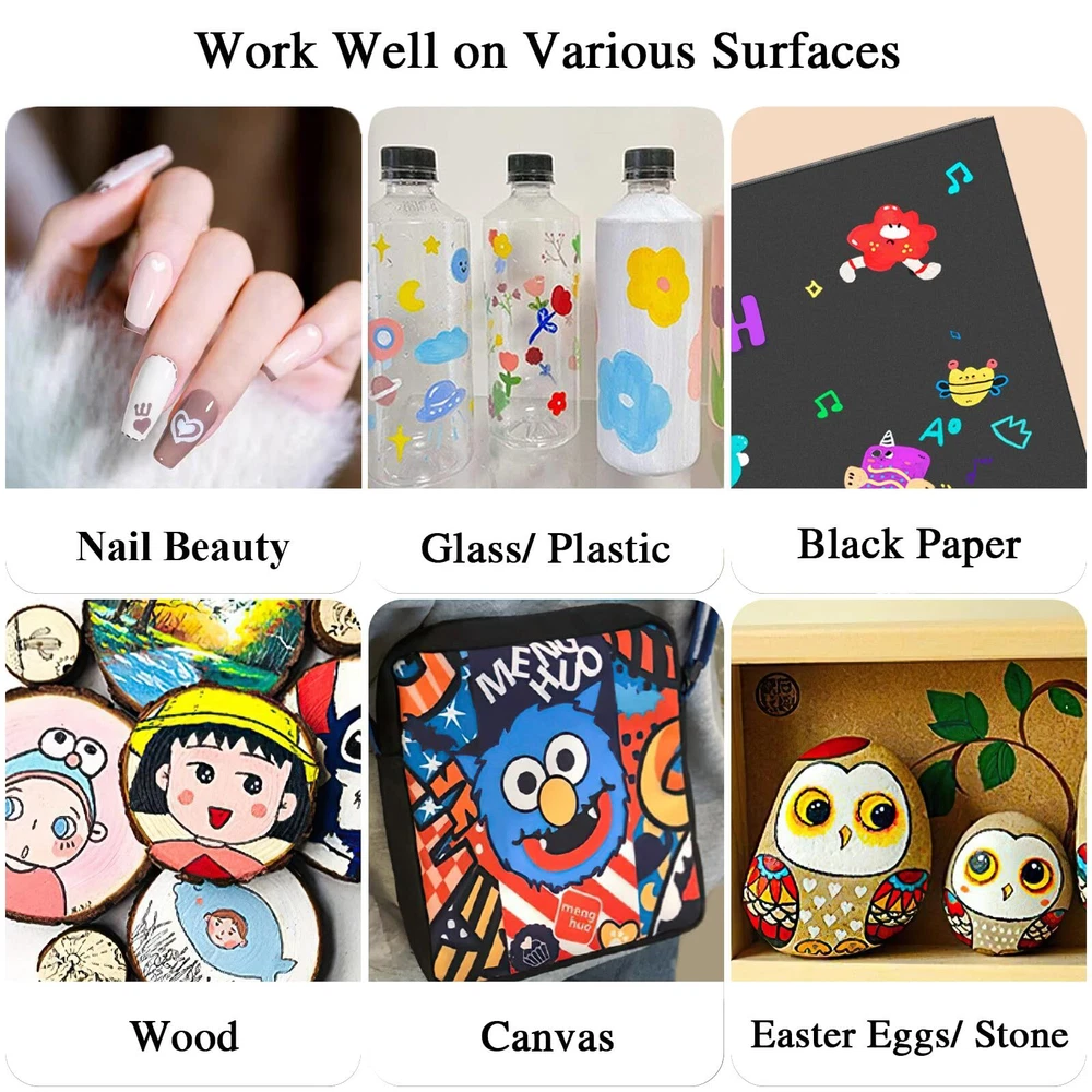 SAYEEC acrylic paint marker comes with a fine nib and a brush nib. The dual tip acrylic paint pens can meet your different painting needs. Our acrylic pens can also be used as a nail art pen. The nail polish pens are ideal for making dots, lines, stripes, flower painting and various creative French nail art. Perfect gift for Birthdays, Halloween, Christmas Day, New Year. Features: 1. High Quality Ink Our acrylic paint markers have water-based ink that dries quickly within 2 minutes, is impervious to paper and does not smudge, is non-toxic and odourless, waterproof, sun-proof, non-fading and has plenty of ink. Easy to clean on the skin. 2. Strong Coverage and Bright Colours The opaque ink has a strong covering power, allowing multiple layers of different colours to be layered on top of existing colours with a natural blend of colours. Drawing on coloured paper, such as black paper, reveals bright colours. 3. Dual Tip Acrylic Markers The fine tip works well for large areas of coloring, and the brush tip is ideal for painting, drawing, calligraphy, lettering and sketching. 4. Fibre Nib A high quality nib that produces ink smoothly and writes fluently. No need to press the nib, just remove the cap and draw, no damage to the nib and no ink leakage. 5. Comfortable Penholder The triangular column penholder for a comfortable grip. 6. Versatile Fit for any surface, including glass, metal, paper, wood, plastic, canvas, fabrics, Easter eggs, etc. Ideal choice to design your scrapbook, journal, greeting card, rocks painting, decorations, etc. Specification: Material: Water-based Ink Color: 24 Bright Colors Pen Size: 6.7×0.4 inch/ 17×1 cm Case Size: 7.2×7×1.18 inch/ 18.3×17.7×3 cm Package Included: 24 × Acrylic Paint Markers HIGH QUALITY INK: Our acrylic paint markers have water-based ink that dries quickly within 2 minutes, is impervious to paper and does not smudge, is non-toxic and odourless, waterproof, sun-proof, non-fading and has plenty of ink. Easy to clean on the skin. STRONG COVERAGE AND BRIGHT COLOURS: The opaque ink has a strong covering power, allowing multiple layers of different colours to be layered on top of existing colours with a natural blend of colours. Drawing on coloured paper, such as black paper, reveals bright colours. DUAL TIP ACRYLIC MARKERS: Come with a fine nib and a brush nib. Our dual tip pens can meet your different painting needs, also allow you to easily create detailed designs on your nails. The fine tip works well for large areas of coloring, and the brush tip is ideal for drawing, calligraphy, lettering, etc. PREMIUM ACRYLIC PENS: A high quality nib that produces ink smoothly and writes fluently. No need to press the nib, just remove the cap and draw, no damage to the nib and no ink leakage. The triangular column penholder for a comfortable grip. VERSATILE: Fit for any surface, including nail, glass, metal, paper, wood, plastic, canvas, fabrics, Easter eggs, etc. Ideal choice to design your scrapbook, journal, greeting card, rocks painting, nail DIY decorations, etc. Perfect gift for birthdays, Halloween, Christmas Day, New Year.