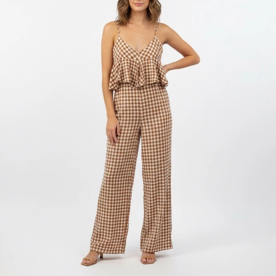 SAYLOR rust and white gingham print jumpsuit. This stylish piece features a flattering peplum waist, adjustable spaghetti straps, and a wide-leg silhouette. Perfect for a brunch date or a summer vacation. Measurements: • Chest: 17 in • Length: 49.5 in • Inseam: 29 in • Waist: 15 in Department: Women Type: Outfit/Set Style: Jumpsuit Fabric Type: Gingham Material: Viscose, Cotton Blend Sleeve Length: Sleeveless Pattern: Gingham Occasion: Casual Set Includes: Pants Number of Pieces: 1 Piece Keywords: SAYLOR jumpsuit, gingham, peplum, wide leg, rust, white, spaghetti strap, summer, brunch, vacation, boho, casual All orders are shipped the same business day or the next business day. Thank you for supporting my small business.