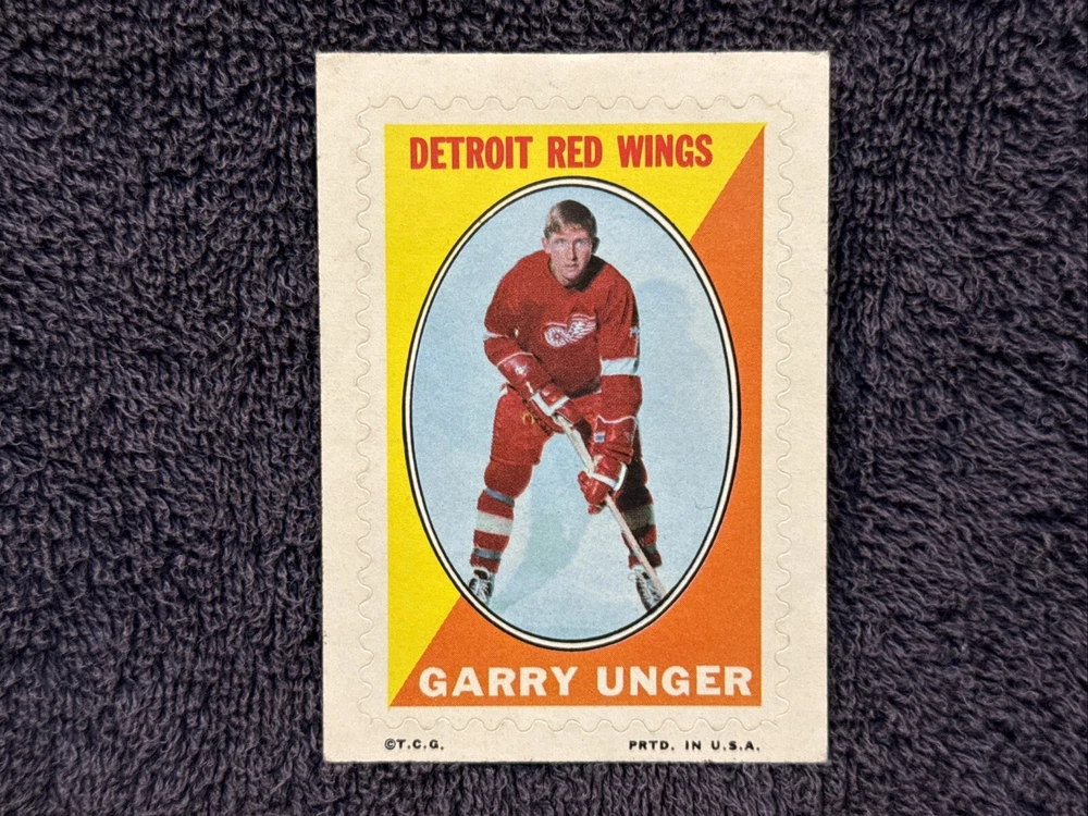 You are purchasing a scarce vintage 1970-71 O-Pee-Chee Garry Unger stamp/sticker card. These are a neat insert in the O-Pee-Chee set. This is a clean vintage card! Card is centered 50-50 LR and 55-45 TB with pack fresh color, gloss and focus. Card shows just a touch of corner and edge wear. Left lower and right upper corners have tiny ding. One teeny bend along top border. Card is free of any creases. Card has a clean front surface. Card has a super clean back. Grades EX! NICE vintage card!! NICE addition to any collection! Buyer pays $5.00 shipping. Shipping combined on multiple lots whenever possible. MN residents add 6.875% sales tax. Thanks for your purchases! Please check out my Ebay store for more great items!