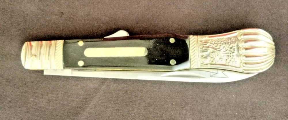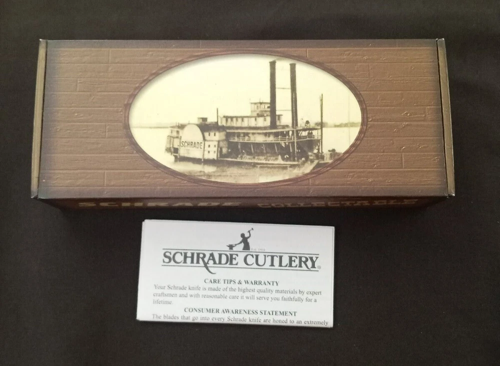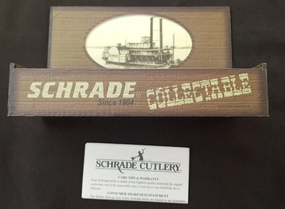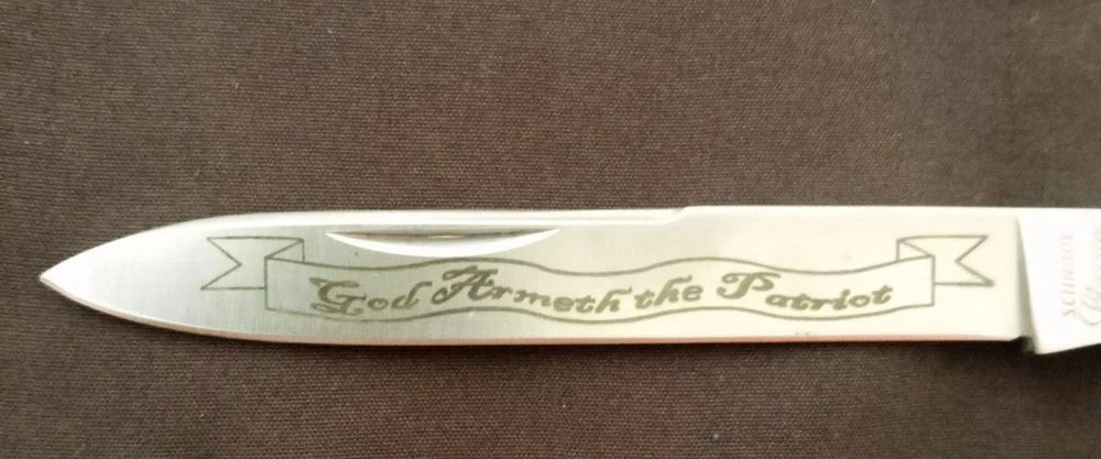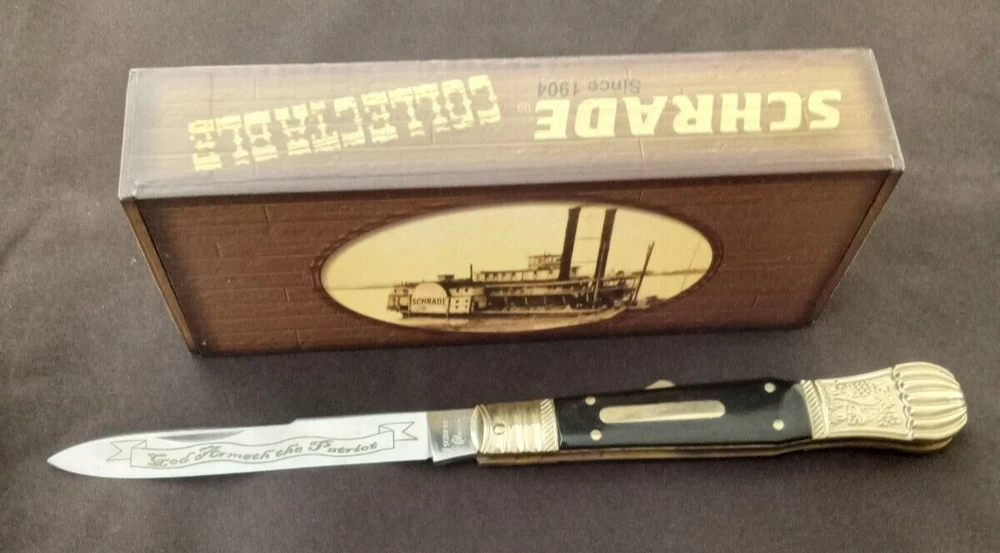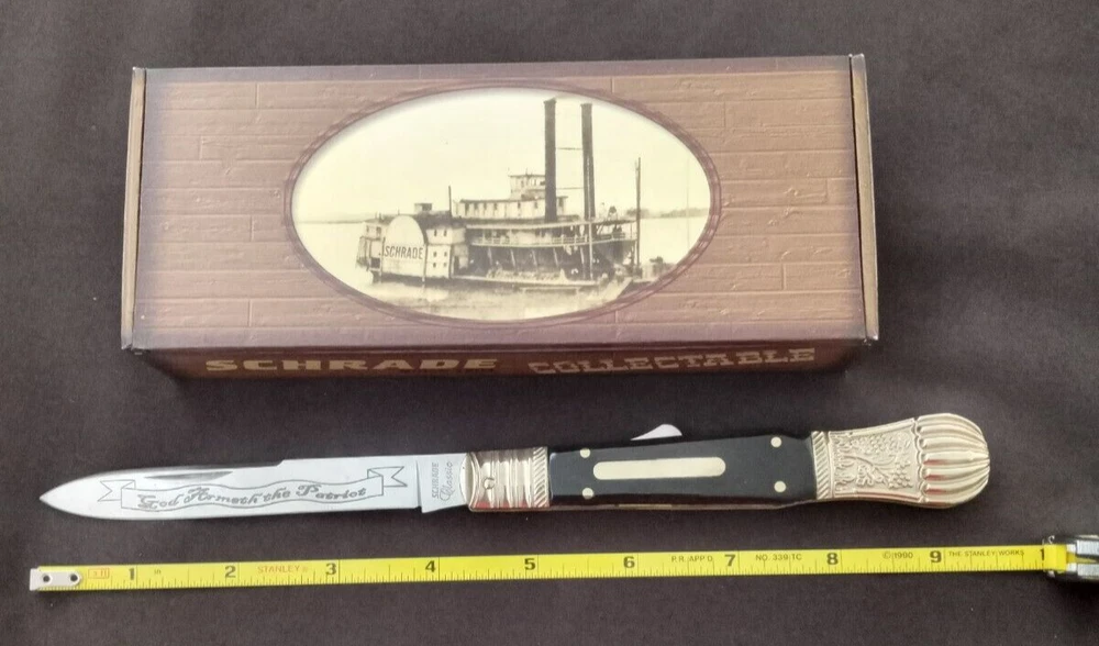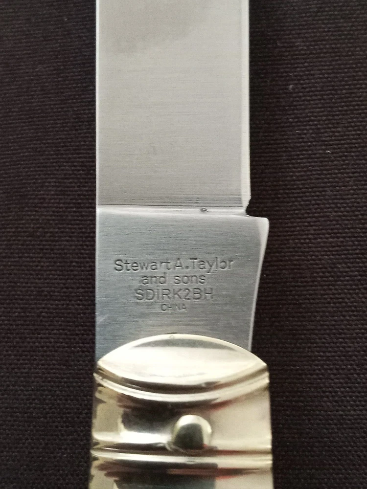 Blade Marked SCHRADE Classic Stewart A Taylor and sons SDIRK2BH DIRK China Blade engraved with God Armetha the Patriot BUFFALO HORN Handle Lockback Knife New In Box, Wooden Box in excellent condition, no tears or rips. Looks to have never been used or sharpened.