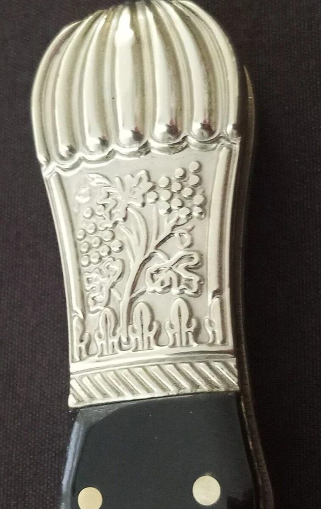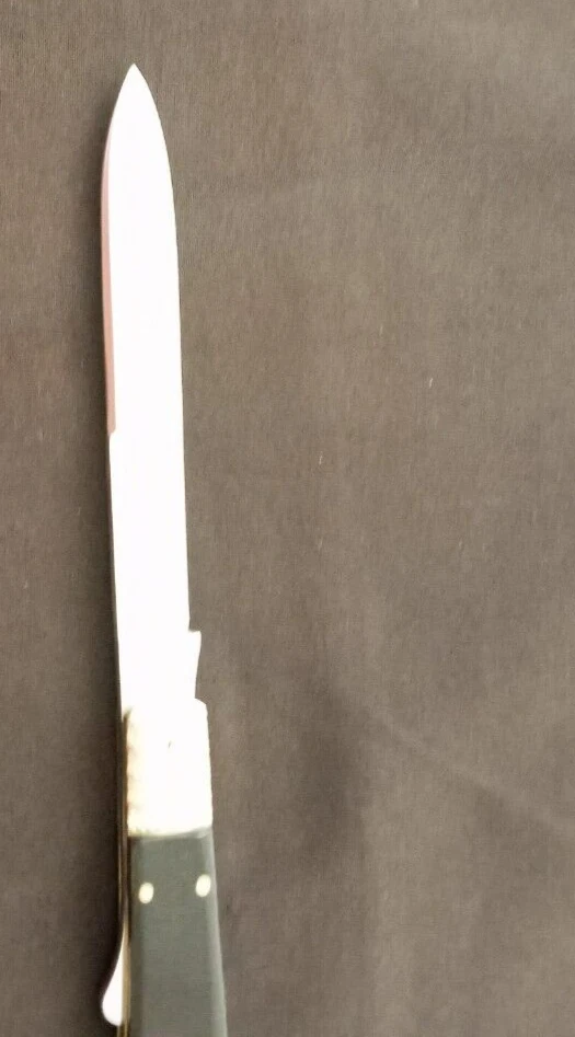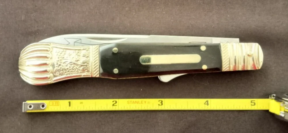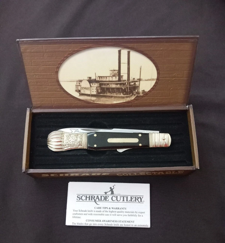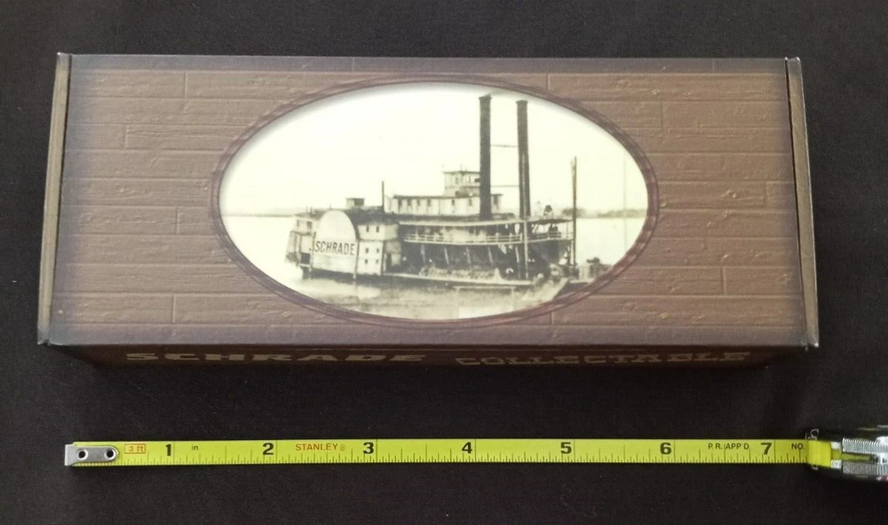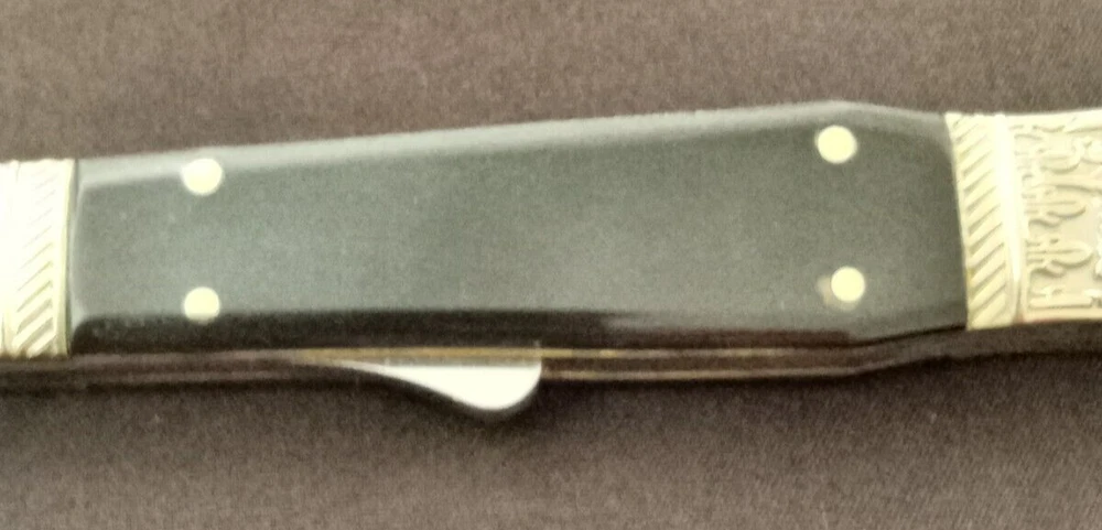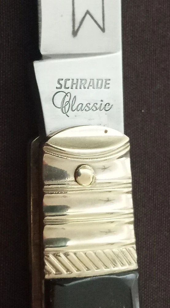 Blade Marked SCHRADE Classic Stewart A Taylor and sons SDIRK2BH DIRK China Blade engraved with God Armetha the Patriot BUFFALO HORN Handle Lockback Knife New In Box, Wooden Box in excellent condition, no tears or rips. Looks to have never been used or sharpened.