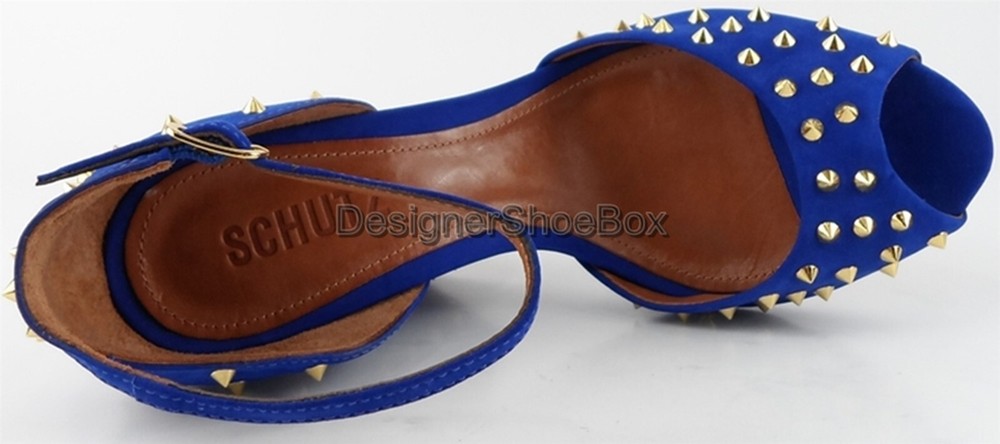 These Schutz pumps are absolutely stunning! The anil blue nubuck leather is rich and luxurious, paired perfectly with the edgy gold-tone spikes. The 4.25" heel gives just the right lift while remaining surprisingly comfortable thanks to the padded footbed. The adjustable ankle strap ensures a secure fit, and the open toe keeps them stylish yet breathable. The craftsmanship is impeccable—you can tell these are high-end designer shoes. Arrived brand new in the original box, exactly as described. A total steal for this price! Perfect for making a bold fashion statement while staying comfortable all night.