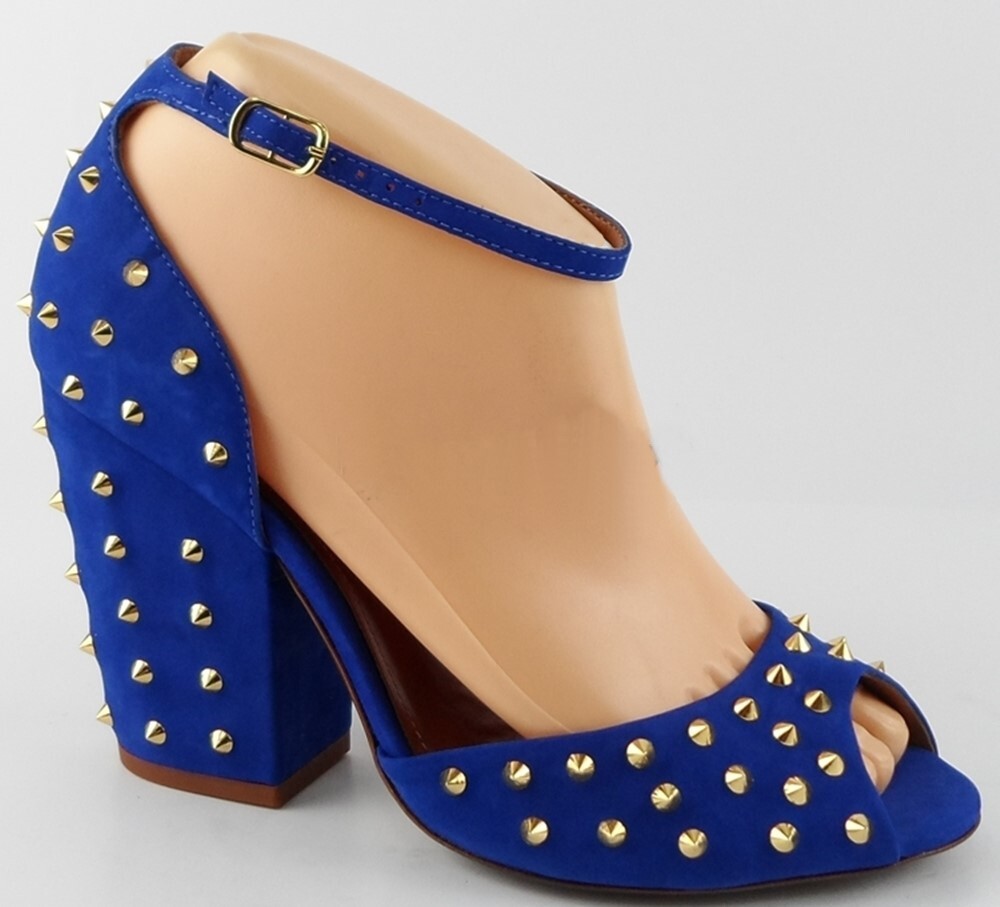New/ clearance in original box Nubuck/ gold tone spikes upper; Leather lining; Leather sole Covered heel measures 4 1/4" * Lightly padded footbed Adjustable ankle strap with side buckle closure Open round toe design Made in BRAZIL *Measurements are hand taken for every item we sell. Every item is carefully inspected to ensure that you receive a quality product. Designer Shoe Box guarantees this product is 100% Authentic