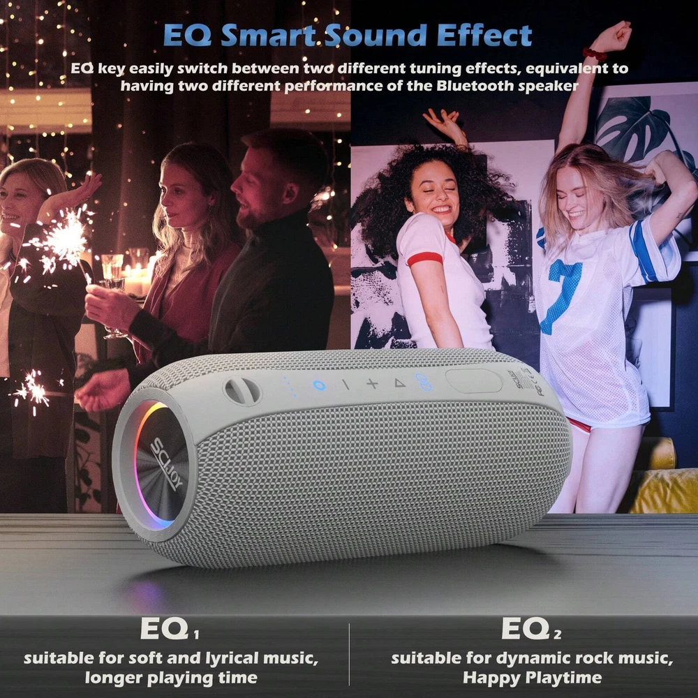 [ Astonishing Sound]40W Bluetooth speaker use advanced digital signal processing chips and dual cavity dual diaphragm stereo drivers, providing clear high-pitched, deep bass, stable midrange. The zero distortion sound effect allows you to fully experience the stunning and loud stereo music scene. [2 Wonderful EQ Smart Modes] The portable speaker bluetooth equipped with two sound integration modes: EQ1 suitable for soft and lyrical music, battery with longer play time. EQ2 enhances heavy bass, suitable for dynamic rock music, with more louder, but with fast power consumption. loud music, select EQ2 mode. With a SCIJOY bluetooth speaker, it is like you have two speakers with different play effects. [True Wireless Stereo]The speakers support two of the same model to pair, achieving more louder play effect and 360° stereo sound, making your party more atmosphere. When the volume of the cellphone and speaker reaches maximum simultaneously, the music will spread to every corner of the room. [Amazing LED Show]Bluetooth speakers with high-quality lights on both sides, which will flicker with the rhythm of the music and present rainbow light show. It creates a great atmosphere for party. Of course, you can choose to turn off the lighting effect when you don't need it. [IPX7 Waterproof]The Bluetooth speaker is superior waterproof that can be used as a good shower speaker. Speakers casing grille is tight, anti slip, and anti fall, sturdy and long lasting, can floating on water, suitable for boating and swimming to use. [Convenient Portable Speaker] The bluetooth speaker is compact, can be hung from a backpack or attached to a bike frame. And large capacity battery provides long life play time for the speaker, making it suitable for camping, hiking and travel etc. [Hands-free calling and Type-c charging]The bluetooth speaker has a built-in microphone to not miss any important call when you are cleaning, cooking and don't have a way to use your cell phone. And improved new Type-c charging port enables fast charging, fully charged in just 4 hours