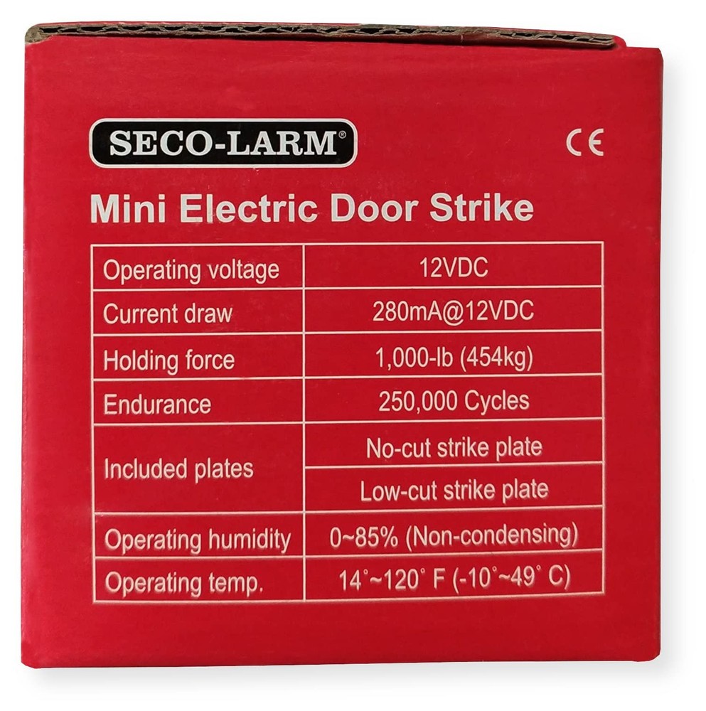 SD-991A-D1Q Mini No-Cut Door Strike For Indoor Use, Converts Cylindrical Lock Sets Into an Electronic Access-controlled Locking System, Stainless Steel Keeper Key Features Converts cylindrical lock sets into an electronic access-controlled locking system Fail-secure operation - Door remains locked if power to the strike is lost 2-wire installation, non-polarized connection Stainless steel keeper for strength and long life Includes Stainless Steel No-Cut and Silver-Colored Aluminum Low-Cut Strike Plates Can be used with virtually any cylindrical door locking system Can be used with an optional digital keypad, pushbutton switch, and other entry devices Suitable for office-type applications Reversible non-handed design fits either right-hand or left-hand doors Shallow design for use with most metal doors Powered by a solenoid, not a buzzer coil For indoor use Specifications Operating Voltage: 12VDC Current Draw: 280mA12VDC Static Strength: 1,000-lb (454kg) Endurance: 250,000 Cycles (Factory tested) Latch Throw: 1/2" (13mm) Operating Temperature: 14°~120°F (-10°~49°C) Operating Humidity: 0~85% (Non-condensing) Dimensions: Stainless Steel No-Cut Plate 2-3/4"x1-1/8"x15/16" (70x28x24 mm) Fail-secure operation - Door remains locked if power to the strike is lost Includes Stainless Steel No-Cut and Silver-Colored Aluminum Low-Cut Strike Plates Can be used with virtually any cylindrical door locking system Can be used with an optional digital keypad, pushbutton switch, and other entry devices Reversible non-handed design fits either right-hand or left-hand doors