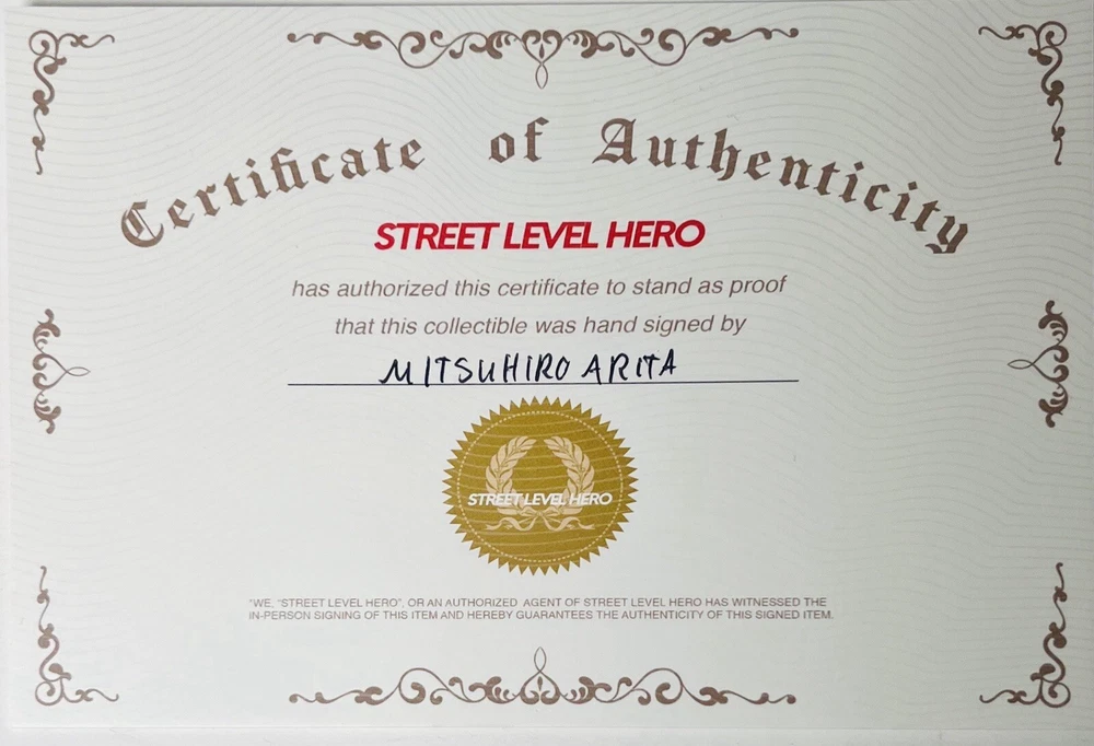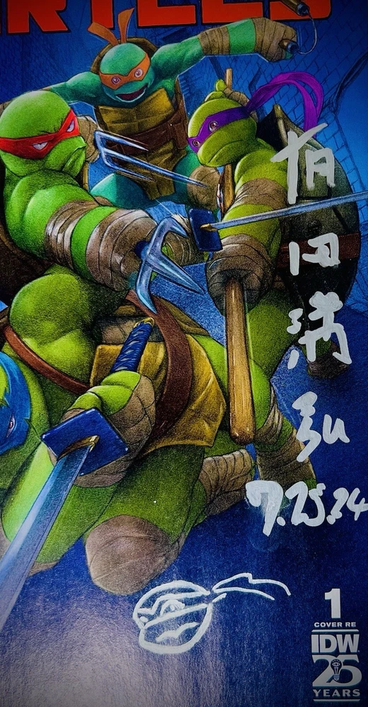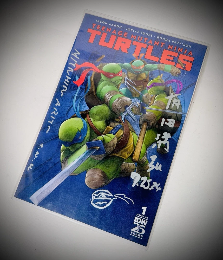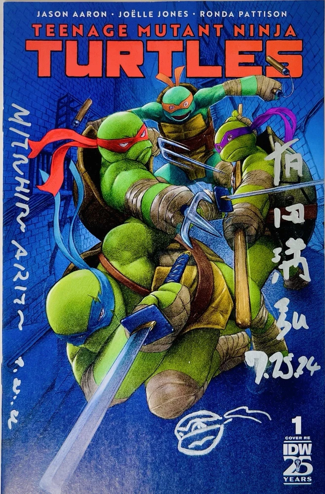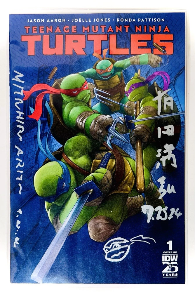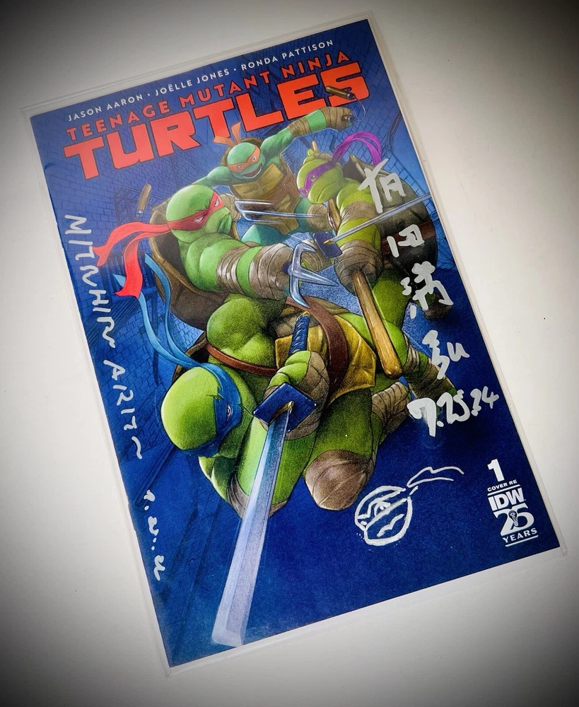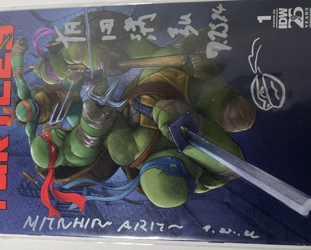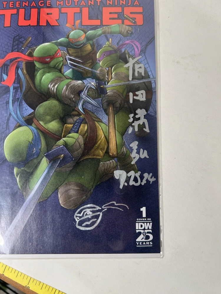 The SDCC 2024 TMNT #1 Return To NYC ARITA VARIANT TRADE CVR is a highly collectible comic book featuring an Incentive Variant cover signed by artist Mitsuhiro Arita. Limited to only 1000 copies, this first edition issue is part of the Teenage Mutant Ninja Turtles series and marks the return of the turtles to New York City. The cover artwork was done by Arita, and also includes both his English signature and highly sought after Kanji signature (both dated 7.25.2024), with an additional remarque by Arita depicting one of the turtles. COA shown in photos above will also be included in the sale. Mr. Arita appears to have signed the COA as well, which adds another layer of exclusivity to this item. Mitsuhiro Arita is known worldwide for his artwork. As freelance illustrator and designer, Arita created artwork for Pokémon cards, Final Fantasy, and other games and publications. He's known for his work on the Pokémon Trading Card Game (TCG), where he's illustrated over 500 cards. He is without a doubt the most notable and popular illustrator in the Pokémon world, and his signatures and artwork often sell for several thousand dollars. Here is a rare opportunity to own not one, not two, but THREE of Arita’s signatures!