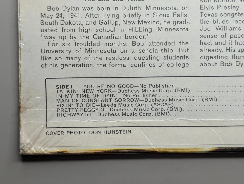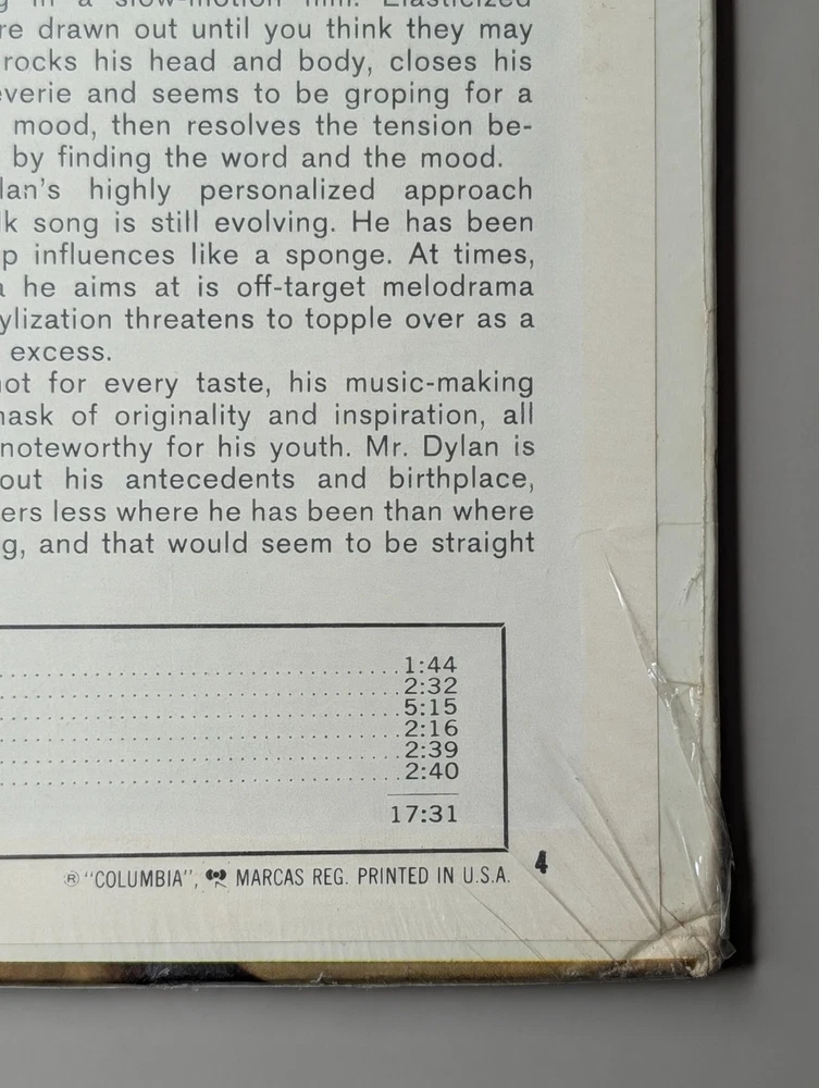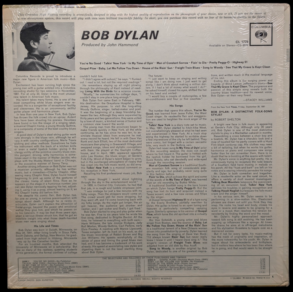 VINYL TITLE โ ARTIST (YEAR) โข CATALOG Artist: Bob Dylan Album: Bob Dylan Label: Columbia Catalog Number: CL 1779 Format: Vinyl, LP, Album, Mono Country: US Released: 1962 ๐ฟ DESCRIPTION This is the monaural pressing of Bob Dylan's self-titled debut LP. The jacket features the original Columbia eye logo and high-fidelity monaural branding. The front cover includes the 1962 copyright notice at the bottom left. The spine is correctly marked with the LP logo and catalog number CL 1779. The back cover features a small number 4 printed in the bottom right corner. The jacket is still in its original shrink wrap, though the wrap shows signs of age with some tearing and peeling at the corners. There is visible corner wear and slight bumping where the shrink wrap has receded. ๐ CONDITION vinyl: Presumed MINT (unplayed) cover: Factory-sealed, never opened (bends on corners) ๐งพ NOTES FOR COLLECTORS This album is a crucial piece of music history, representing the world's introduction to Bob Dylan. Recorded in just three sessions in November 1961, the album captures Dylan at age 20. This particular copy is a definitive first edition pressing from 1962. A key identifying feature for serious collectors is the digit 4 printed on the lower right of the back cover. This code identifies the jacket fabricator as Imperial Packing Co., Inc., based in Indianapolis, Indiana. In the early 1960s, Columbia Records utilized specific codes to identify their packaging suppliers, and the "4" confirms this as an authentic original jacket from the Indianapolis plant. The 1962 mono version is highly sought after for its raw, direct sound. Early pressings like this one originally came with the Columbia 6-eye label, which was replaced by the 2-eye label later that year, marking this as the earliest state of the release. ๐ MATRIX / LABEL DETAILS Label: Columbia Mono (6-eye or early 2-eye) ๐ฆ SHIPPING ๐ฎ STANDARD: 5โ30 DAYS โ FREE SHIPPING โ๏ธ INTERNATIONAL PRIORITY: 5โ15 DAYS โ 30$ ๐ FEDEX EXPRESS: 3โ7 DAYS โ 65$ WORLD OF AUDIOPHILE (EBAY SELLER) 100% POSITIVE FEEDBACK โข FREE SHIPPING WORLDWIDE FOLLOW ON INSTAGRAM: @WORLD_OF_AUDIOPHILE โญ LATEST BUYER FEEDBACK โABSOLUTELY STUNNING VINYL! PERFECTLY PACKED, LIGHTNING FAST SHIPPING. 10/10 SELLER!โ โ BUYER FROM USA VIEW MORE FROM WORLD OF AUDIOPHILE