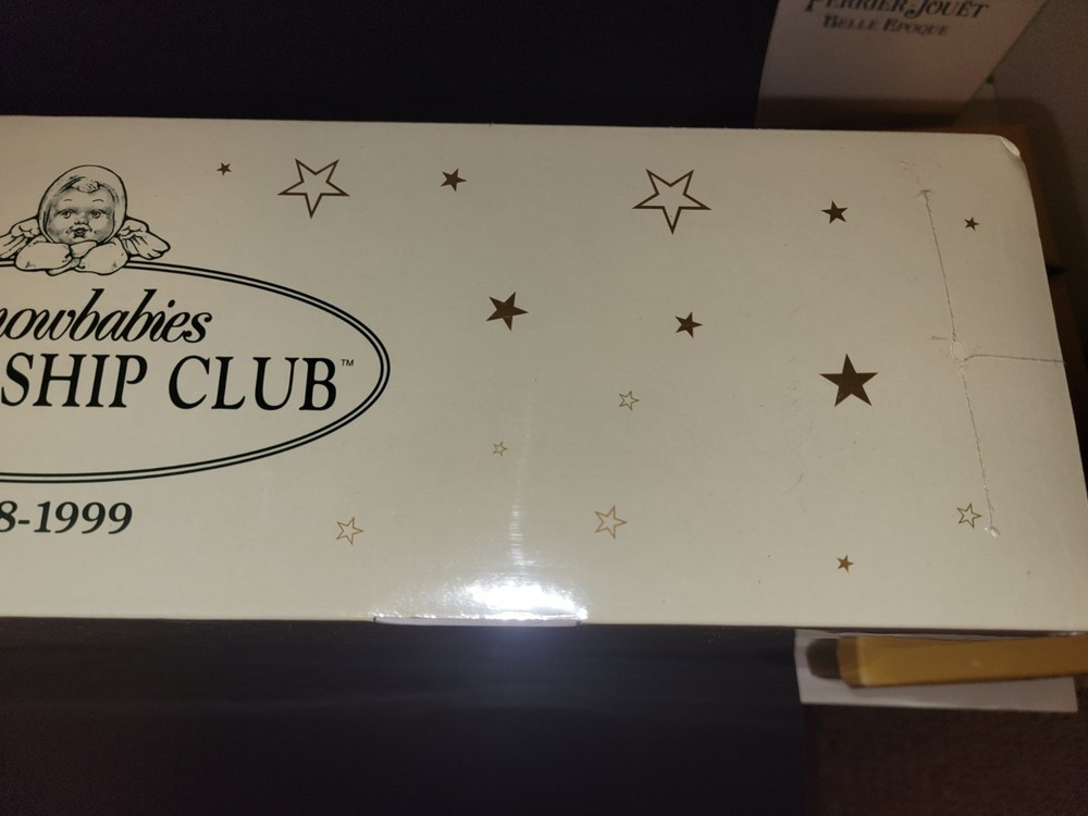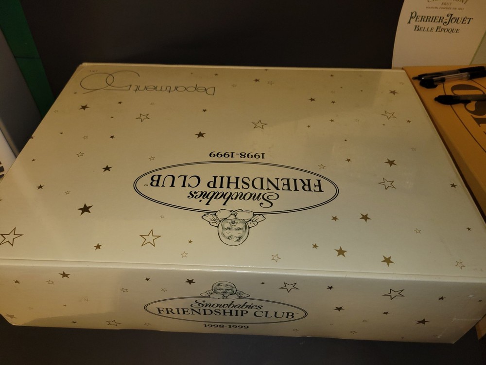 This item has never been opened, and with that I am not sure how the inside has aged. Item has been kept with other fragile items and all have been kept in great condition. The Snowbabies research i have done show this item to be 'Baby its cold outside'. The item number listed on the box is 68889. The SEALED Department 56 Snowbabies Friendship Club 1998-1999 Box Set #68889 is a ceramic and porcelain figurine depicting an angel character from the Snowbabies collection. Made in China in the late 20th century, this white figurine comes boxed and weighs 4 lbs. Part of the holiday and seasonal collectibles, this matte finished piece is a unique addition to any adult's Department 56 collection.