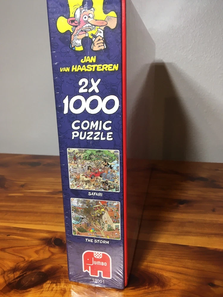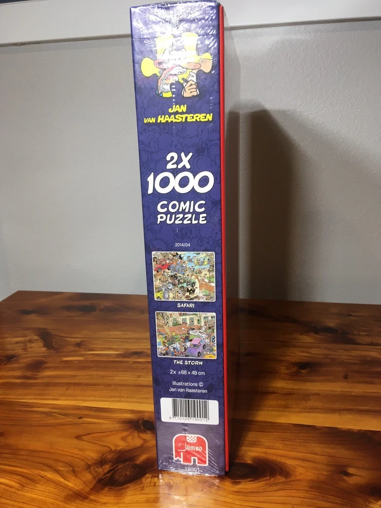 Brand new in SEALED box, with plastic wrap. Issued in 2014, only time released together. Experience the thrill of putting together this amazing Jan Van Haasteren puzzle from Jumbo. With TWO 1000 pieces, this puzzle is sure to keep you entertained for hours. The puzzle features a colorful and vibrant image of a Safari and The Storm, making it a great addition to any puzzle collection. Get ready to put your puzzle skills to the test with this challenging and fun puzzle.