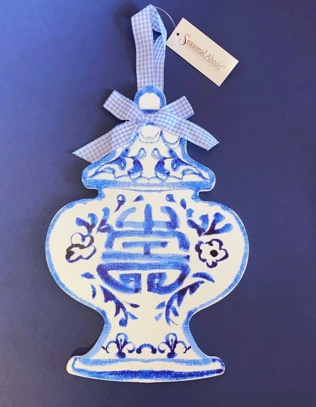 SEASONAL ABODE NEW WITH TAGS Asian oriental blue and white chinoiserie designed ginger jar large ornament or wall hanging. Blue floral and Chinese design. [3 designs available] Solid white back. Blue and white check bow hanging loop. 11" high The matching ornaments are available. 734145-150, 168-77 (B81)