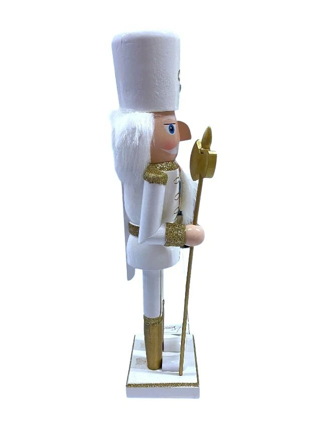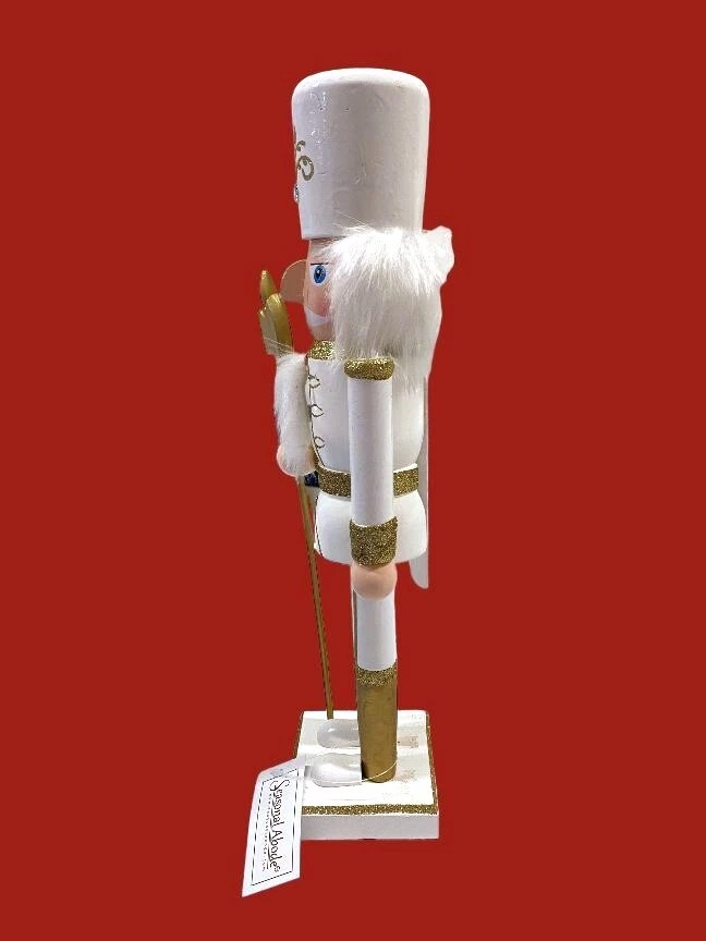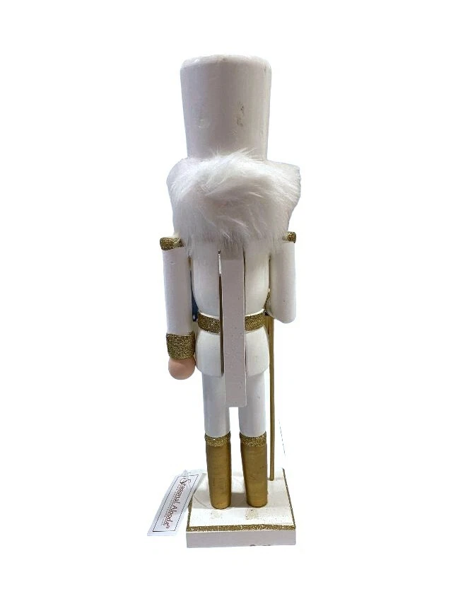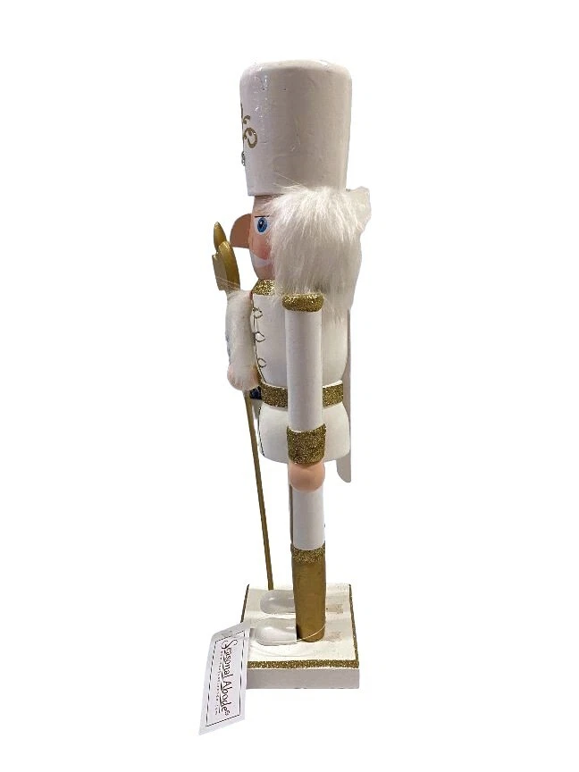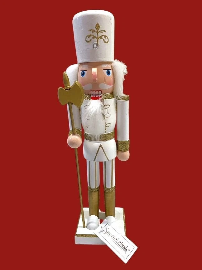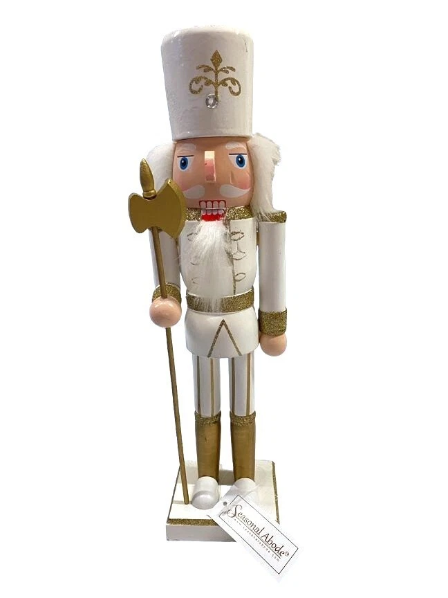 SEASONAL ABODE NEW WITH TAGS Classic white soldier featuring gold glitter trim working nutcracker. Tall wooden nutcracker featuring his sword. Trimmed in faux fur. 14.25 " high 734279-82