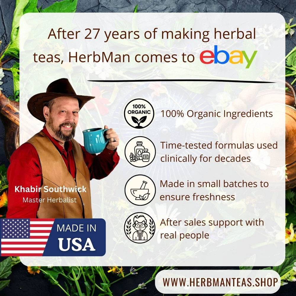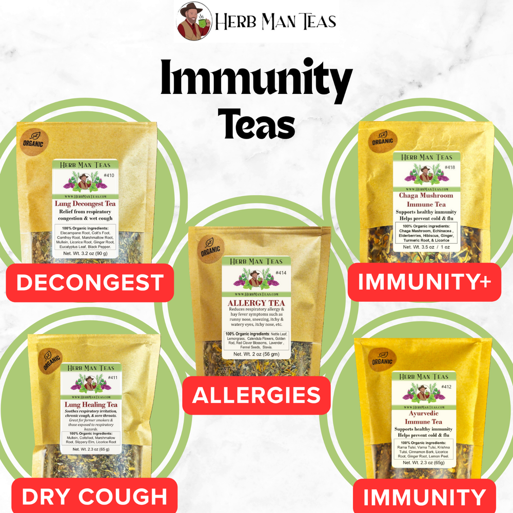 No more allergy meds! For sneezing, runny nose & itchy eyes! Works well for seasonal and pet allergies. 100% Organic ingredients: Nettle Leaf, Lemongrass, Calendula Flowers, Red Clover Blossoms, Goldenrod, Lavender Flowers, Fennel Seeds ABOUT FORMULA There’s no need to suffer from seasonal or pet-related allergies anymore. This tea provides a gentle, natural solution for common allergy symptoms like sneezing, itchy throat, runny nose, and watery eyes. Unlike conventional allergy medications that often cause drowsiness or lose effectiveness over time, this herbal formula supports your body’s natural defenses by reducing histamine levels and calming inflammation in the respiratory tract. Perfect for: Pet allergies (cats, dogs) Hay fever and pollen reactions Dust or mold sensitivities Itchy, watery eyes and nasal congestion Client Experiences: “Helped me avoid pet allergy reactions just with one cup in the morning.” “Keeps my cedar-fever in check with 2–3 cups a day during allergy season.” ABOUT HERBS Herb-by-Herb Benefits Nettle Leaf – A powerful natural antihistamine that helps reduce sneezing, runny nose, and sinus inflammation. It also supports immune system modulation and eases the allergic response. Goldenrod – Traditionally used for respiratory allergies, goldenrod reduces nasal inflammation and supports sinus drainage. It also acts as a mild decongestant and antihistamine. Lemongrass – Has anti-inflammatory and antimicrobial properties that soothe the respiratory tract. It also helps relieve mild coughing and throat irritation. Calendula Flowers – Soothes irritated mucous membranes in the nose and throat. Known for its gentle anti-inflammatory and healing actions. Red Clover Blossoms – Promotes gentle detoxification to reduce systemic allergic responses. It also supports immune balance over time. Lavender Flowers – Calms the nervous system and relieves stress-related allergy flare-ups. Also offers mild anti-inflammatory effects on the airways. Fennel Seeds – Helps reduce sinus pressure and nasal congestion while supporting healthy digestion, which is important for overall immune function. HOW TO TAKE How to Use Boil 8 oz of water and turn off the heat Add 2–3 tablespoons of loose herbs to a cup or pot Steep for 10–15 minutes (longer = stronger), strain, and drink Use a reusable tea strainer or empty tea bag if preferred Drink early in the day before symptoms begin for best results Pair with one or more of the following: Lung Decongest Tea (SKU: 410) — For respiratory conditions with heavy mucus. View Listing Ayurvedic Immune Tea (SKU: 412) — For prevention of cold & flu. View Listing Immune Tea with Chaga Mushrooms (SKU: 418) — ideal if acne is linked to allergic reactions or sudden skin flare-ups. View Listing TIPS & NOTES Note: Advanced herbal teas are highly concentrated and significantly more potent than typical teas, tinctures, or single herbs. Many blends include up to 50 carefully selected herbs, designed to work synergistically for maximum effectiveness. These teas are often tailored to address specific health concerns and are selected based on your unique health profile. Before purchasing, we recommend reviewing each product’s description to ensure it suits your individual needs. For chronic or more complex health issues, consider scheduling a Zoom consultation with Khabir . He can create customized herbal teas or formulas and provide personalized dietary guidance tailored to your condition. Testimonials "I had been suffering from severe allergies for years. I lost hope in resolving these health issues. On top of that, my allergy and sinus were getting worse due to the cold weather. When I drink the allergy tea, my allergies are almost gone!" - Naila Khan, Daly City, CA. "With Khabir's Allergy tea, I now know how to lessen and sometimes eliminate my post-nasal drip." - Marilyn Lauer, San Francisco, CA About Herb Man Teas For years, this product has been a trusted solution in the clinics of Khabir Southwick, aka HerbMan , a highly respected Registered Herbal Pharmacist and Ayurvedic Doctor. If you're dealing with advanced or complex health conditions, this tea is designed to offer targeted relief. However, for personalized guidance, a Zoom consultation with Khabir is highly recommended. Make Appointment with Khabirs Clinic What sets Herb Man Teas apart is the expertise behind them. Formulated by Khabir Southwick, an internationally recognized herbal pharmacist with nearly 30 years of experience, these teas have been carefully developed, tested, and perfected over decades of clinical use. They're not just products; they're solutions backed by years of real-world experience. Discover more at Herb Man Teas WARNING: It's easy for anyone to put loose-leaf tea in a bag and make bold claims. But true herbal efficacy requires deep knowledge of herbal pharmacology and traditional healing formulas. A truly great formula isn't just about " it should work ". It's about years of patient feedback and refinement. Don't settle for products created from online research alone; experience and expertise make all the difference. "Herb Man Teas, the best herbal teas on the planet! "