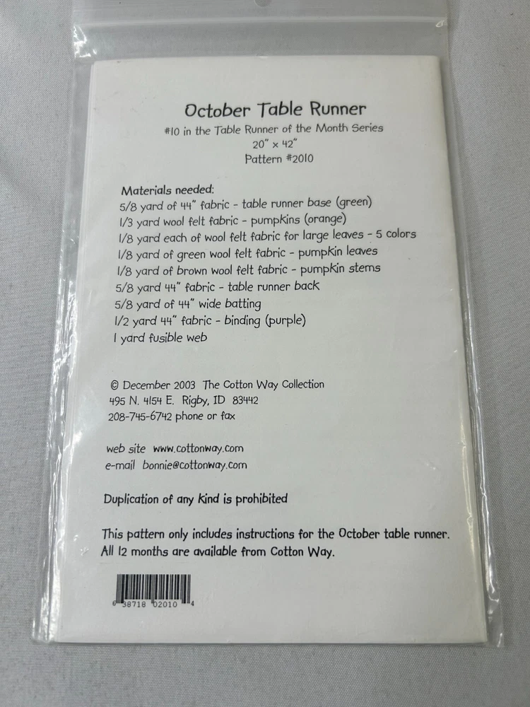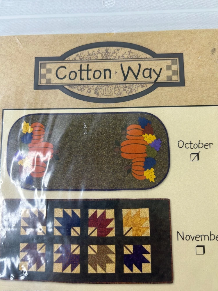 "SEASONAL TABLE RUNNERS" OCTOBER QUILT PATTERN BY COTTON WAY Add a touch of seasonal charm to your table with this pieced quilt pattern by the Cotton Way. Made in the United States, this pattern features the Cotton Collection brand and is perfect for quilting, sewing, and crafts. Whether you're an experienced quilter or just starting out, you'll love creating these beautiful table runners that are perfect for any occasion. The pattern includes instructions and tips to help you create stunning pieces that will impress all your guests