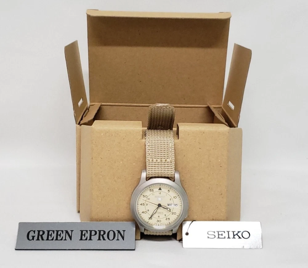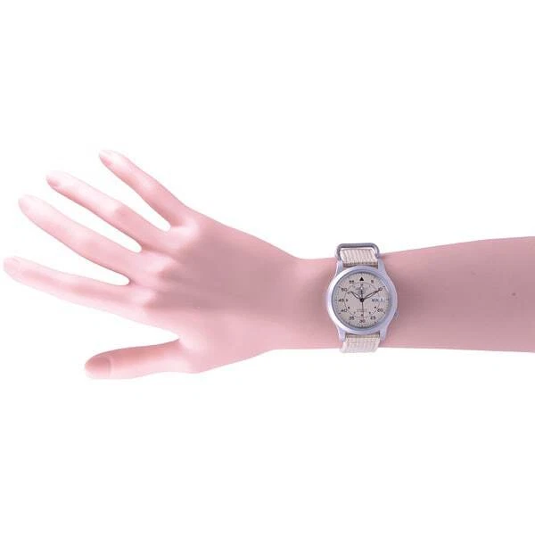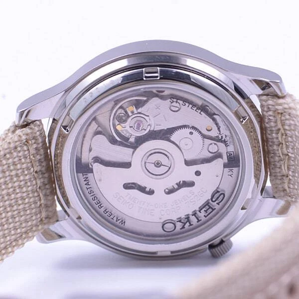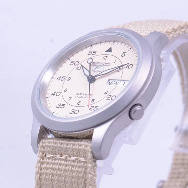 water_resistance_depth: 30.0 pattern: Plain color Brand: SEIKO gtin13: 722631291441 number_of_lithium_ion_cells: 0.0 color: Dial color - beige Style: watch item_shape: Round special_feature: arabic numerals UPC: 722631291441 Type: NA Reference Number: SNK803 manufacturer: SEIKO batteries_included: false item_package_quantity: 1.0 lithium_battery: [{value:batteries_contained_in_equipment}] calendar_type: day date clasp_type: buckle dial_window: [{language_tag:ja_JP, value:Hardlex Crystal Glass}] Display: [{language_tag:ja_JP, value:analog}] band: [{unit:millimeters, value:18.0}] Department: mens target_gender: male age_range_description: adult num_batteries: product_specific dial: [{language_tag:ja_JP, value:beige}] number_of_lithium_metal_cells: 1.0 batteries_required: false watch_movement_type: mechanical case: [{unit:millimeters, value:11.0}] battery: [{value:mercury_oxide}] part_number: SNK803 sport_type: military item_display_dimensions: {unit:inches, value:1.46} warranty_type: Please refer to the condition description of each retailer. model_number: SNK803