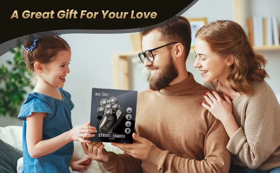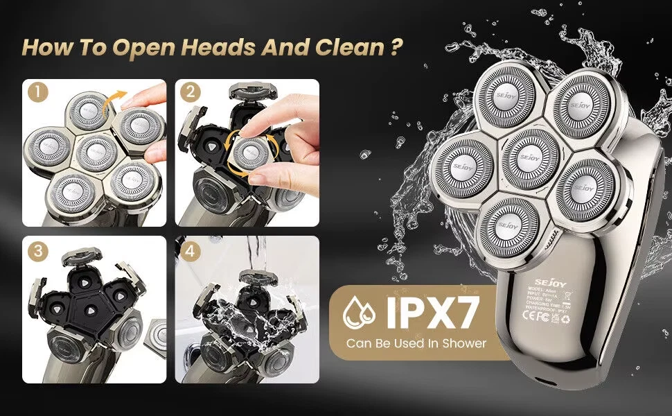 5 in 1 Muiltfunction IPX7 Waterproof LED monitor & Power display Flexible & Smooth 6D Floating Head Shaver Upgraded Detachable Shaving Head Multifunctional electric head shaver for men with 5 replacement shaver heads: smooth texture, hair trimmer, nose hair trimmer, massage brush, cleaning brush.Our head shaver for bald men is so powerful that can meet your daily needs. Exquisite head shaver grooming kit is your best choice for a fast and smooth shave. Also your perfect birthday and holiday gift idea. 2 This SEJOY shaver is IPX7 water resistant and still works properly when immersed in water. This allows the SEJOY shaver to be used both wet and dry, making it easy to use even in the shower. 3 With the LED indicator, you can clearly see how much energy is left in this device. In addition, it can be used up to ninety minutes per full charge. 4 Ultra flexible 6D pivoting blade design increases the shaving area and saves shaving time. 6D precision rotating head shaver and rounded edges move smoothly across the skin with a premium motor to ensure more hair is shaved with each pass for a smooth and close shave, giving you a more comfortable and efficient shaving experience. 5 Designed for those men who love sporting a clean-shaven head but are tired of using razors or blades. Featured new upgraded detachable design facilitates deep cleaning of the shaver head. Our professional head shaver easier to clean than other models, simply detach the entire blade for water washing and easy storage 6 We offer five different accessories, with a rich variety of ways to use. This razor you can use for yourself or as a gift for your family and friends. Shipping is only available to the continental U.S. (No shipping to Puerto Rico, Hawaii, or Alaska).