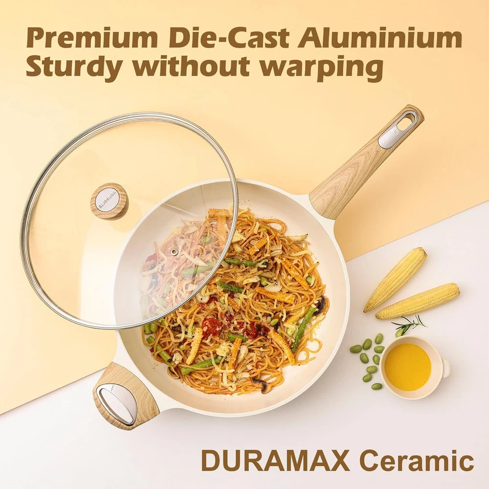 SENSARTE Ceramic Cookware Sets, Pots and Pans Set 14 PCS, White Product Details Material: Aluminum, Ceramic Color: Ceramic White Brand: SENSARTE Size: 14 PCS Handle Material: Anti-scald Bakelite Handles Healthy Ceramic Cookware Sets - SGS approved. Non-toxic, free of PTFE, PFAS, PFOA, PFOS, APEO, lead, cadmium and other toxic substances that can leach into food. Naturall Nonstick - Ceramic non-stick is healthier and scratch-resistant with excellent food release. Only less oil is needed for cooking, for a healthy, low-fat diet. 14 Piece Pots and Pans Set Includes - 8 & 9.5 inch frying pan set, 12inch/5Qt saute pan with lid, 6.5Qt casserole with lid, 2Qt saucepan with lid, 2pcs multi-purpose utensils, 4pcs pot protectors. Induction Compatible - 4.8mm thick stainless steel pan bottom makes this cookware set suitable for all stovetops. Die-cast aluminum construction allows the pan to heat up quickly and evenly, keeping the heat consistent. No warping and durable. Easy to Clean - Simply wipe with a paper towel or rinse with water, hand washing is recommended as it cleans effortlessly. Stay-Cool Handle & Glass Lid - The anti-scald wood-grain Bakelite handle is ergonomically designed for comfort and ease of handling. The explosion-proof glass lid prevents splashing and ensures maximum visibility.