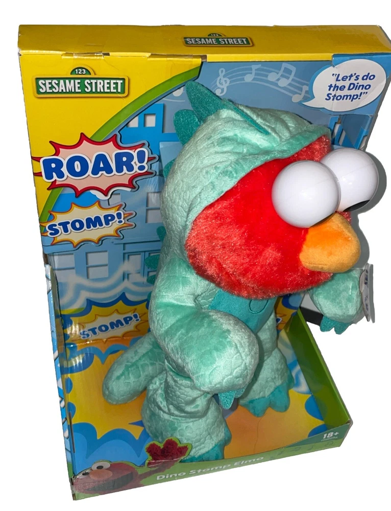 This is a Sesame Street Elertonic Elmo Plush Toy named Dino Stomp Elmo, measuring 13 inches. It is a teal-colored plush stuffed animal that sings and dances. Suitable for children aged 18 months and older, it belongs to the Sesame Street character family. Great for playtime and entertainment for kids between 1-4 years old.