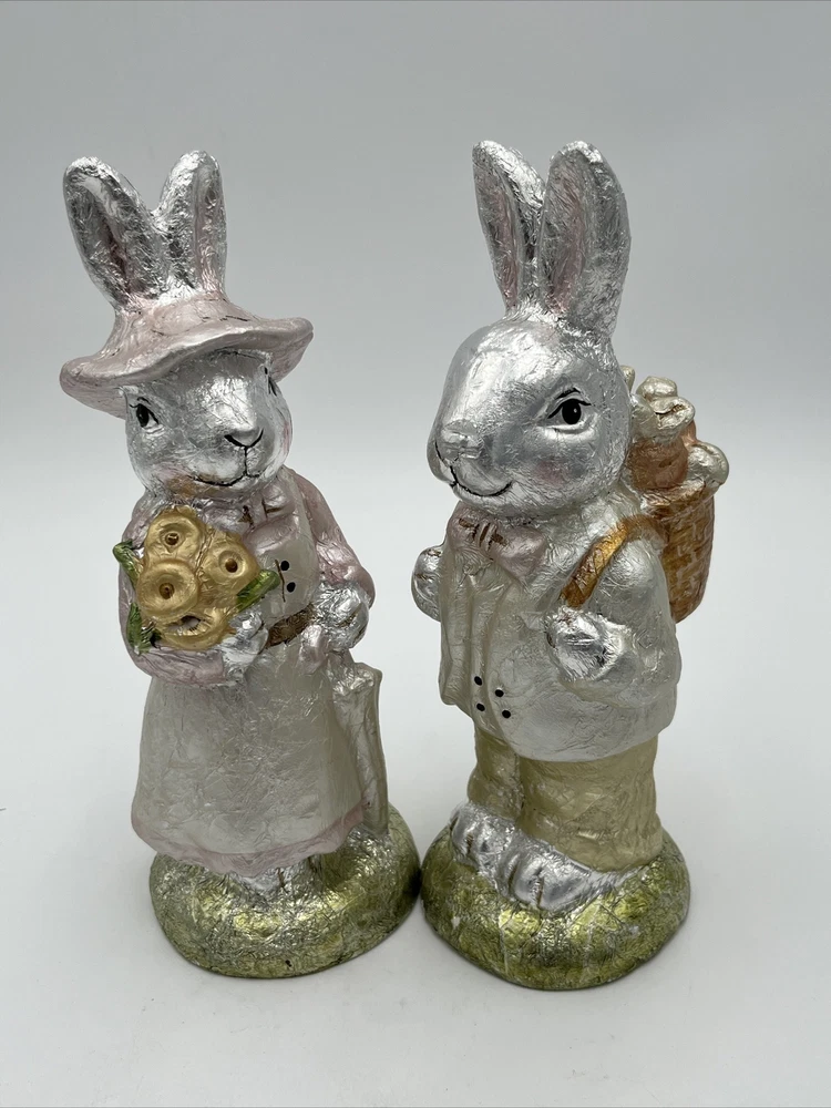 Absolutely Adorable Pair of GANZ Easter Figurines. each measures approximately 9.5" Tall and has a faux finish that makes them look like foil wrapped. light pastel colors are beautiful. Please View all Photos as they are the most important part of any description. My home is smoke free and one minimally shedding Goldendoodle Friendly. Blue the Goldendoodle is not allowed in my office where items are stored. with that said. Most of my items are sourced second hand. I always take care to make sure I buy things in good to excellent condition and dont notice any odors or stains. HOWEVER since these items are not from my personal home or collection I cannot guarantee habbits of previous owners nor what kind of pets they may or may not have had.