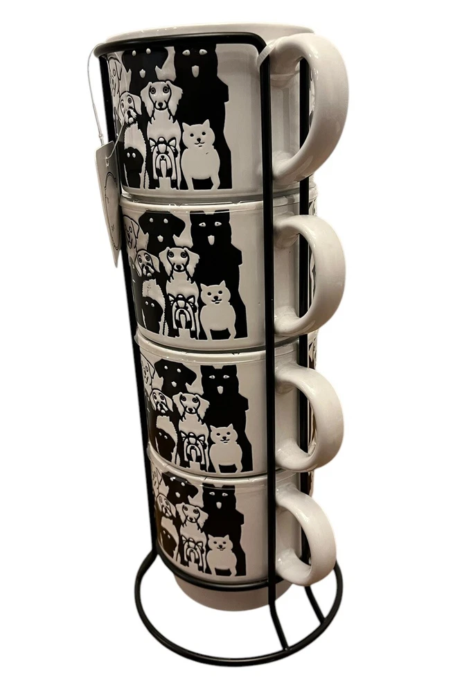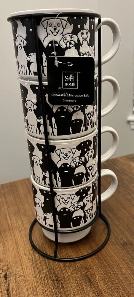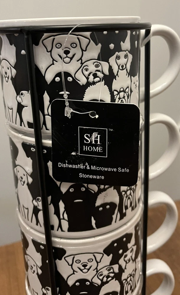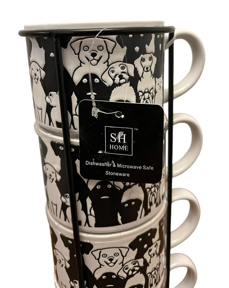 SH Home Stackable Mugs Black And White Dogs Stoneware Set Of 4