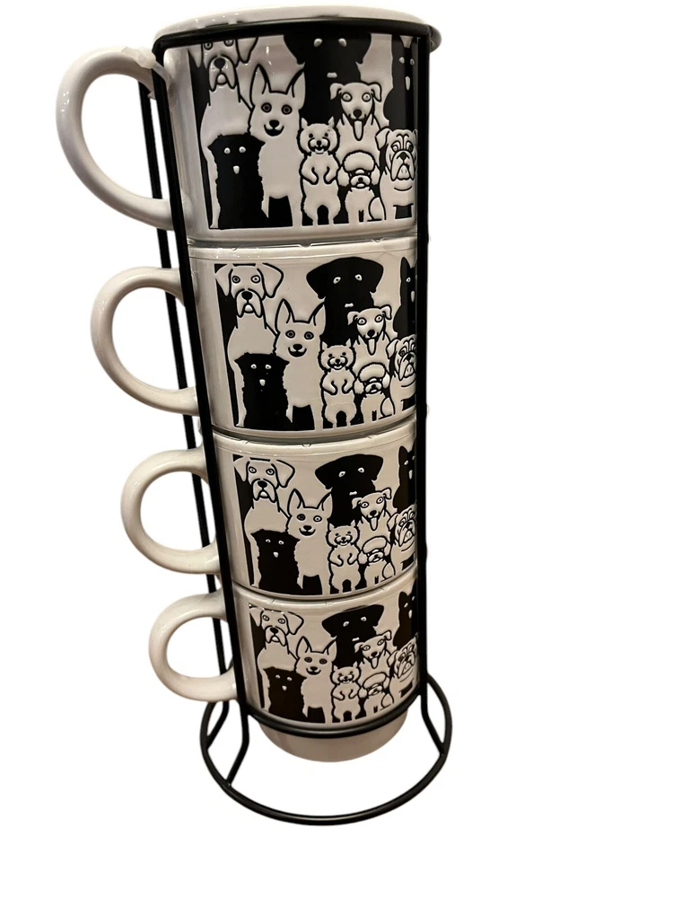 HomeSH Home Stackable Mugs Black And White Dogs Stoneware Set Of 4