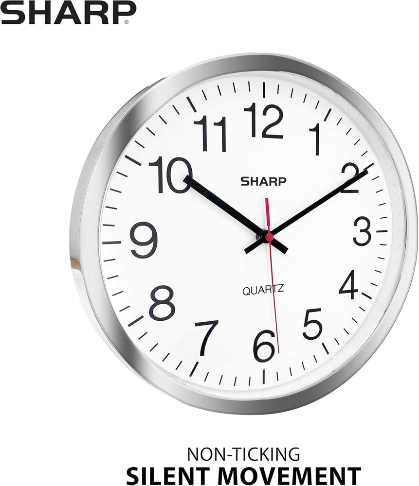 SHARP 12 Inch Silent Non-Ticking Quartz Wall Clock in Sleek Silver Chrome Finish