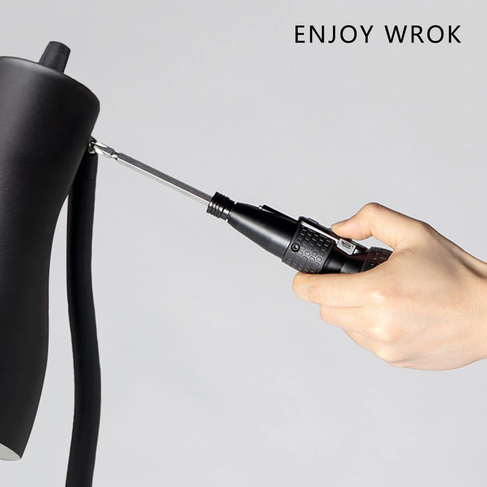 Integrated manual and automatic mode, the maximum electric torque is 3N.m, and the maximum manual output torque can reach 10N.m Long tip material: good material-S2-steel, high hardness, good toughness, imitating the appearance of traditional screwdriver, good feel, light weight, low noise, easy to operate Power your cordless screwdriver anytime, anywhere with micro USB charging LED light easy to see the work space even in dimly lit places This small electric screwdriver will help you start any home improvement DIY project and is also friendly to women, easy to take