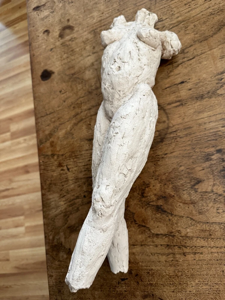 This stunning sculpture by Sherri Cavan (1938-2016) features a large torso of a woman painted with cream-colored clay. The piece stands at 19 inches tall and is an original, single-piece work. The sculpture is an excellent addition to any art collection and is perfect for those who appreciate expressionism and American culture. The item is listed by a dealer or reseller and is an original.The sculpture is medium-sized and has a bust format. The piece is perfect for those who are looking for a unique and beautiful figurine to display in their home or office. THIS SCULPTURE NEEDS TO BE LEANED AGAINST SOMETHING OR A STAND ...