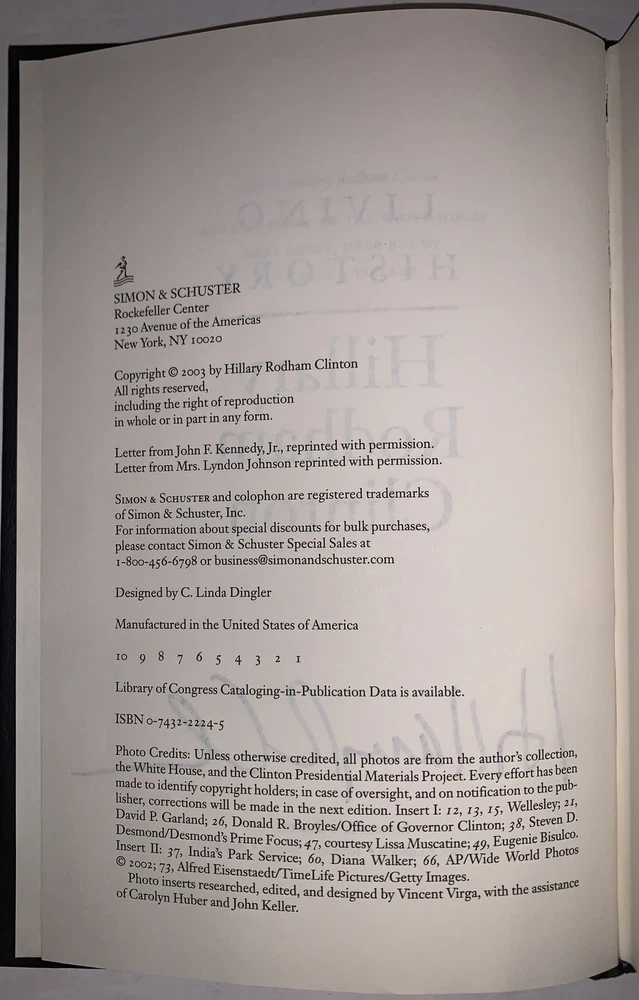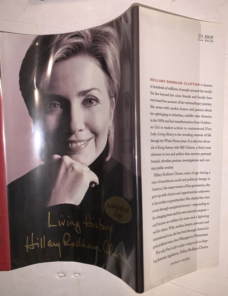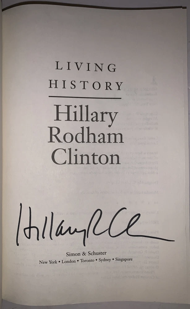 Living History by Hillary Rodham Clinton New York: Simon & Schuster 2003 First Trade Edition, First Printing Signed by Hillary Clinton on the title page. Octavo, xi, 562 pages, publisher's original pictorial dust jacket. Publisher's original gilt lettered, blind stamped black cloth over black boards. Illustrated with sections of black and white photographs. Dust jacket now in protective mylar sleeve. Laid in, is a catalogue description from a prior dealer [Bauman Rare Books]. In fine condition. If you have any questions, feel free to ask, and don't forget to check out my other listings.