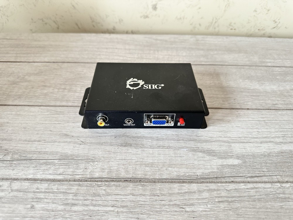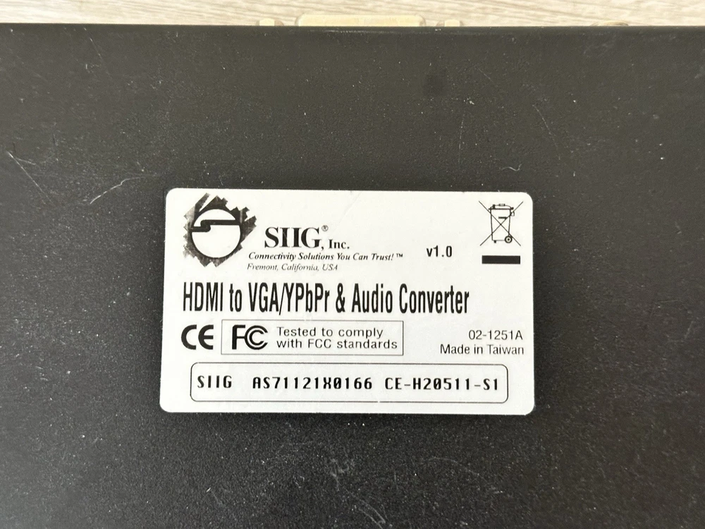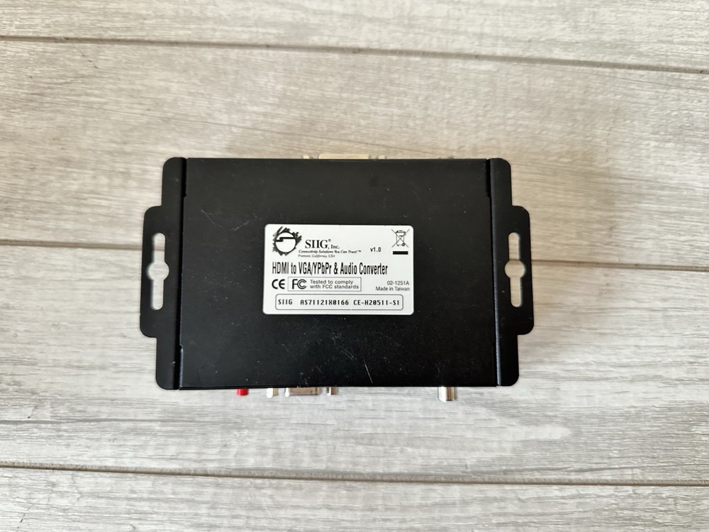 Item: SIIG HDMI to VGA/YPbPr & Audio Converter Model: AS71121X8166 | Version 1.0 Condition: Used, fully tested and working. This high-quality SIIG converter allows you to connect HDMI devices to legacy displays using VGA or YPbPr component video, with stereo audio output. Perfect for projectors, older monitors, and AV setups in classrooms or offices. Features: • Converts HDMI signal to VGA or Component (YPbPr) • Stereo 3.5mm audio output • RCA video out • Durable metal housing • Ideal for presentations, legacy tech setups, or repurposing older AV gear