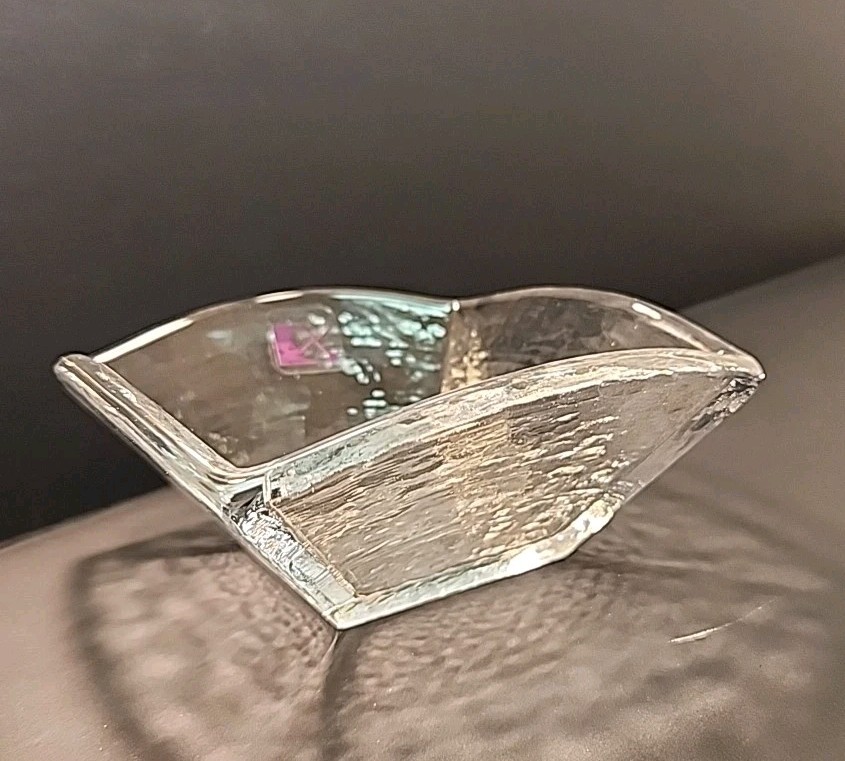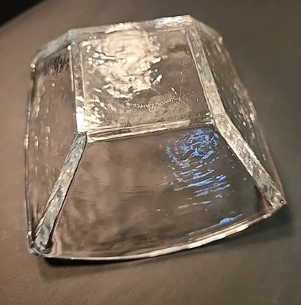 The SIMON PEARCE Curved Square Bowl is a hand-made art glass piece that is 5 inches in diameter and 2 inches in height. Made in the USA by the renowned Simon Pearce Brand.