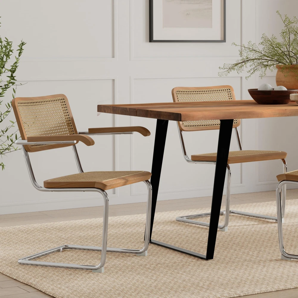 Bring mid-century modern elegance to your dining space with the Madalyn Dining Armchair Set. These handcrafted chairs blend natural beech wood frames with handwoven rattan seats and backrests, offering both style and comfort. The polished chrome cantilevered base adds a sleek, contemporary touch, while the curved arms provide ergonomic support for extended seating. Perfect for family meals or entertaining guests, these versatile chairs complement various decor styles, from minimalist to eclectic. Their durable construction and timeless design make them ideal for busy households looking to create a stylish yet functional dining area that can withstand daily use. Additionally, the natural materials used in the construction of these chairs ensure they are not only aesthetically pleasing but also environmentally friendly. The Madalyn Dining Armchair Set is a perfect blend of form and function, making it a valuable addition to any home. Whether you're hosting a dinner party or enjoying a quiet meal with family, these chairs will enhance your dining experience with their comfort and elegance. DIMENSIONS: 23.1" D x 19.1" W x 31.7" H Hand Constructed using solid wood, rattan, metal Seat and backrest are in a woven rattan in natural Multi-functional chair can be used in kitchen, dining room, office or sitting area Mid Century Modern styling includes a comfortable woven rattan seat and back, solid wood armrest and curved metal frame and base