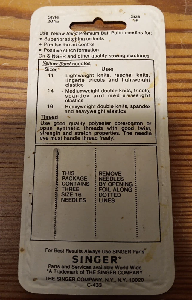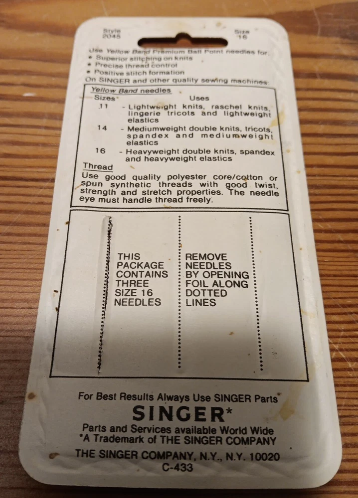 Enhance the performance of your Singer sewing machine with this pack of 2 premium ball point needles, style 2045 size 16. These needles feature a yellow band and are compatible with Singer machines. They are perfect for sewing on knit fabrics and will help you achieve professional-looking results. Use them for your next sewing project and enjoy the smooth and precise stitching they provide. ** One needle has been used out of the package **