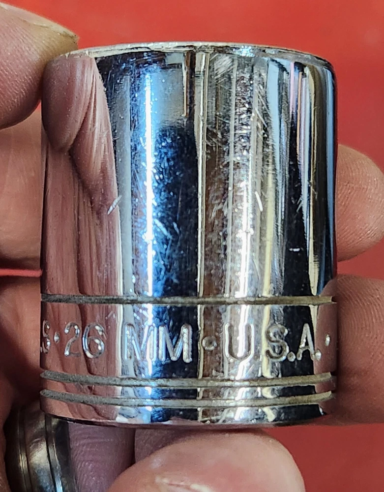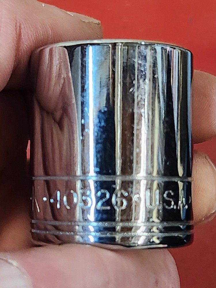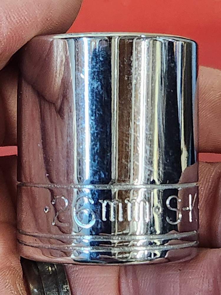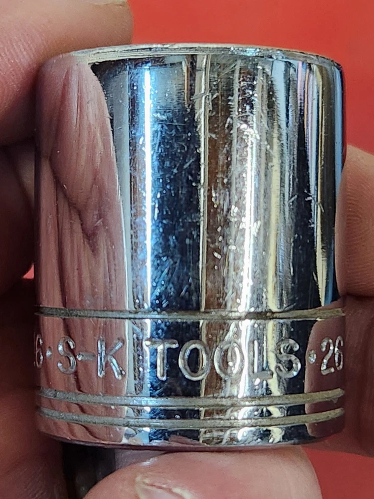 SK 1/2" Drive 26mm Shallow Socket 40326 12pt Many Styles NOS Vintage USA New old stock S-K Tools USA 1/2" drive 26mm sockets. They are all model 40326 but from different eras so I've offered the option to select the style you prefer, but if this doesn't matter than you can pick any one of them. Some of the same style may still have some slight variances. Have shelf wear including light scratches, light blemishes, small nicks, and other light signs of wear from long-term storage. The level of shelf wear varies but all are unused.