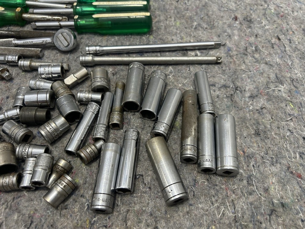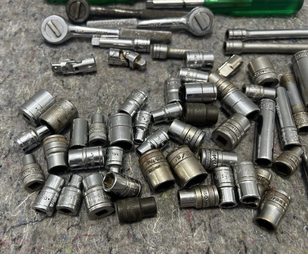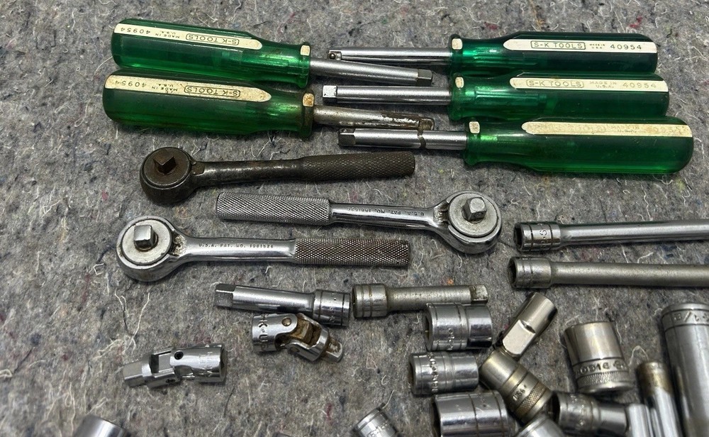 Storage unit find. Recycling items found in abandoned storage units at auction. Large lot of S-K Tools S-K Wayne USA 1/4” drive sockets, ratchets and drivers. Deep and shallow, 6 point and 12 point SAE and Metric. Please review all photos for condition of exact items included in this auction, items being sold as is as found. See my other auctions for more great vintage and rare tool finds.