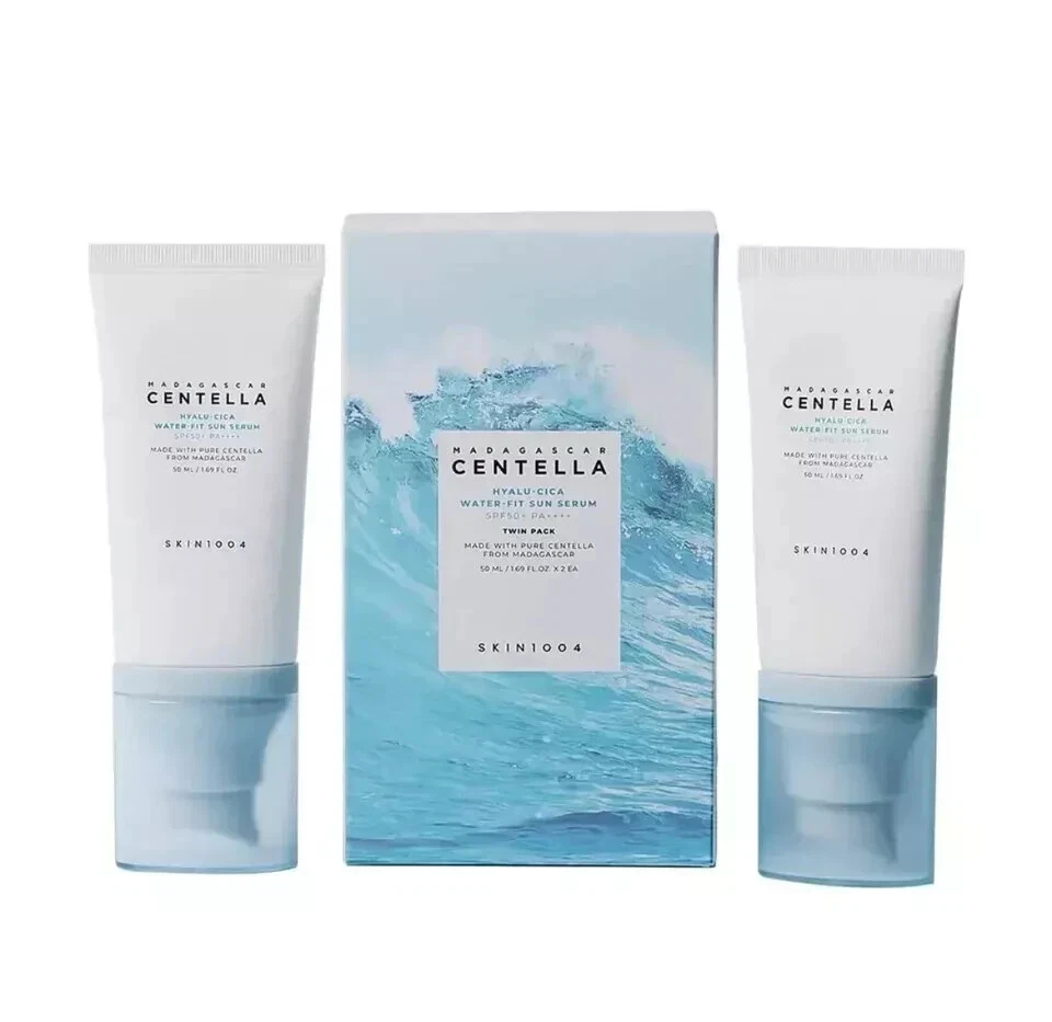 The SKIN1004 Madagascar Centella Hyalu-cica Water-Fit Sun-serum SPF50+ Twin Pack is a revolutionary skincare product that combines advanced sun protection with skin-nourishing ingredients. This serum is formulated with Centella Asiatica extract from Madagascar, known for its soothing and healing properties. It contains Hyaluronic Acid, which deeply hydrates the skin and improves elasticity. The lightweight texture of the serum makes it easy to apply and absorbs quickly into the skin without leaving a greasy residue. With SPF50+ PA++++, it provides high-level protection against both UVA and UVB rays, preventing sunburn and premature aging. The twin pack offers great value for money, ensuring you have a backup supply of this essential skincare item. It is suitable for all skin types, including sensitive skin, and can be used daily as part of your skincare routine. The serum helps to brighten the complexion, reduce redness, and promote a more even skin tone over time. Its non-comedogenic formula won't clog pores, making it ideal for acne-prone skin as well. Overall, the SKIN1004 Madagascar Centella Hyalu-cica Water-Fit Sun-serum SPF50+ Twin Pack is a must-have for anyone looking for effective sun protection and skin hydration in one product.