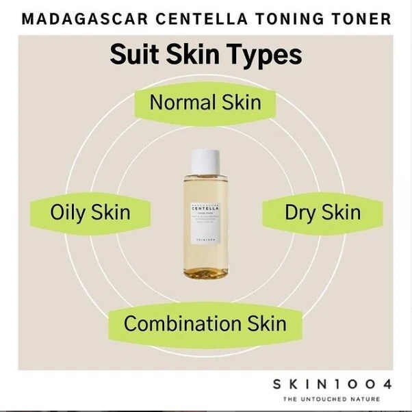 Product Description: SKIN1004 Madagascar Centella Toning Toner is a gentle exfoliating and hydrating toner infused with Centella Asiatica extract sourced from Madagascar. It helps to calm irritation, strengthen the skin barrier, and maintain moisture while providing mild exfoliation with PHA (Polyhydroxy Acid) . The lightweight formula absorbs quickly, leaving the skin refreshed and balanced without any sticky residue. Benefits: Calms & Soothes: Centella Asiatica extract lessens inflammation and redness. Mild Exfoliation: PHA eliminates dead skin cells without bothering or drying out the skin. Hydrates & Refreshes: Increases skin elasticity and replenishes moisture. Maintains a robust and healthy skin barrier by balancing the pH of the skin. Safe for Sensitive Skin: Devoid of alcohol, harsh chemicals, and artificial perfumes. uses: Use a daily toner after cleansing to help the skin absorb serums and moisturizers more effectively. Gentle exfoliation: Aids in removing dead skin cells and smoothing out the texture of the skin. Reducing redness and irritation brought on by external stresses is the goal of the soothing treatment. Hydration Boost: For additional hydration, it can be layered several times. Every Type of Skin: Oily, dry, combo, and sensitive skin types can all benefit from it. About this Item: Soft Exfoliation: PHA (polyhydroxy acid) is used to gently exfoliate dead skin cells without irritating delicate skin. Calming & Hydrating: Contains extract from Madagascar Centella Asiatica to soothe skin irritation and provide deep moisture. The skin's natural pH is maintained by the balanced pH formula, which supports a robust and healthy skin barrier. All skin types can use it because it is lightweight and non-sticky, absorbing rapidly without leaving a greasy or sticky residue. Absent Dangerous Ingredients Safe everyday usage is ensured by the formulation's lack of alcohol, dangerous additives, and artificial perfumes.