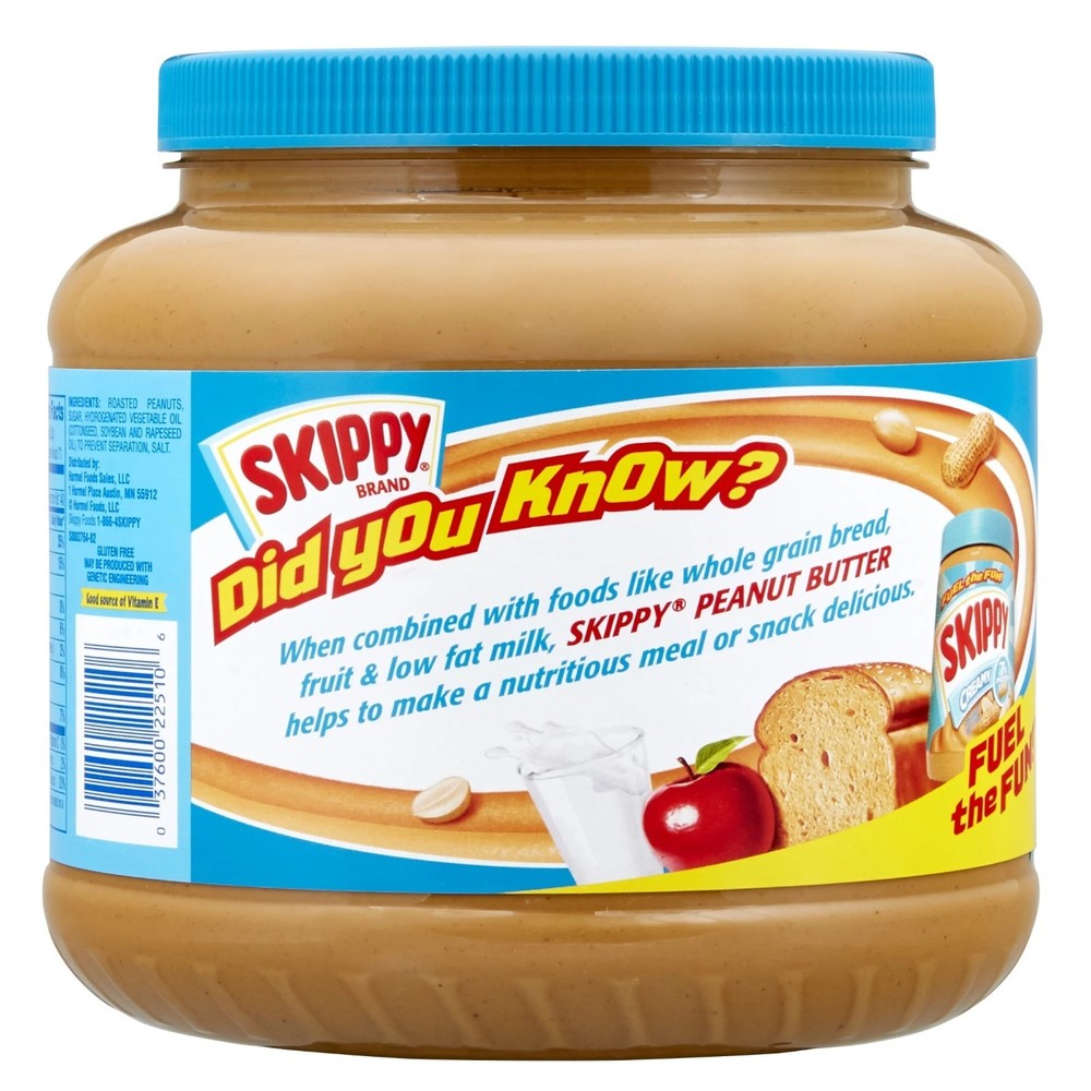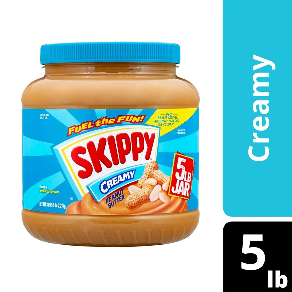 SKIPPY Peanut Butter, Creamy, 7 g Protein Per Serving, Shelf-Stable, 80 oz Plastic Jar Go to your SKIPPY place! For over 80 years, SKIPPY has been spreading smiles with its rich, creamy peanut butter. Made from real roasted peanuts and just four simple ingredients, this smooth classic delivers the perfect balance of sweet and savory peanut flavor. ✅ Classic Peanut Butter Taste – Smooth, creamy texture that’s perfect for sandwiches, snacking, or recipes ✅ Nutritious & Delicious – 7g of protein per serving to help restore energy and keep you feeling charged ✅ Simple Ingredients – Made with real roasted peanuts, no added preservatives, no oily mess ✅ Free From – Gluten free, tree nut free, no artificial flavors or colors, certified Kosher ✅ Trusted Brand – A pantry staple since 1933, loved for generations ✅ Family Size – One 80 oz plastic jar, ideal for meal prep, lunchboxes, and family snacking Spread it on whole grain bread, pair with fruit, or add to smoothies and desserts. Whether you prefer a hearty snack or a robust sandwich, SKIPPY Peanut Butter hits the spot every time. Contains: One 80 oz jar of SKIPPY Creamy Peanut Butter.