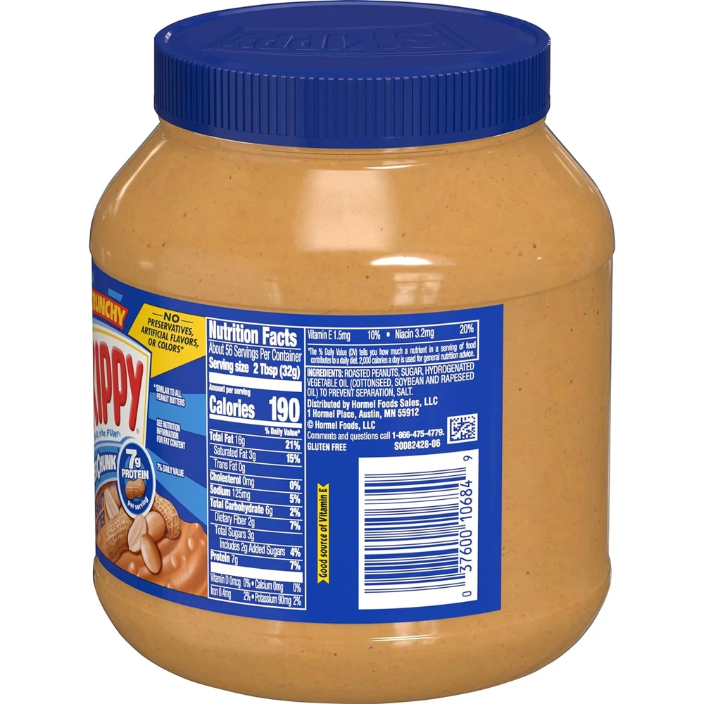 One 64 oz. jar of SKIPPY SUPER CHUNK Peanut Butter Spread. Four simple ingredients with a sweet and savory peanut flavor and just seven grams of protein and zero grams trans-fat Every jar is blended with loads of real peanut pieces and, when combined with nutritious foods like whole grain bread, fruit and milk, helps restore energy and leaves you feeling charged - nothing but great snacking with this creamy classic SKIPPY Peanut Butter Makes Nutritious Delicious. Real roasted peanuts with no added preservatives, free from artificial flavors or colors, certified Kosher, gluten free and tree nut free Just the right combination of sweet and savory peanut flavor, it’s been a staple on grocery lists and in pantries for over 80 years Since 1933, SKIPPY Peanut Butter has been building trust and loyalty with peanut butter lovers. Try Chunky, Creamy, Reduced Fat, SUPER CHUNK spread and more Go to your SKIPPY place! Our SUPER CHUNK Peanut Butter Spread makes every snack heartier and every sandwich more robust with loads of real peanut pieces! It’s the taste that packs a crunch, SKIPPY hits the spot with just the right combination of sweet and savory peanut flavor. SKIPPY Peanut Butter makes nutritious delicious when combined with foods like whole grain bread, fruit and milk – so spread the smiles! Our peanut butter helps restore energy and leaves you feeling charged; no wonder it’s been a staple on grocery lists and in pantries for over 80 years! Made with four simple ingredients, we only use real roasted peanuts with no added preservatives – no separation and no oily mess. You get 7 grams of protein and 0 grams trans-fat, so it’s great snacking with this smooth, creamy classic. Free from artificial flavors or colors, certified Kosher, gluten free and tree nut free, it’s creamy peanut buttery perfection! One 64 oz. jar of SKIPPY SUPER CHUNK Peanut Butter Spread. Try them all: Chunky, Creamy, Reduced Fat, SUPER CHUNK spread and more. Since 1933, the SKIPPY brand continues to be the choice for peanut butter lovers, providing peanutty fun for lunchboxes, picnics, and kitchen tables everywhere. All trademarks, logos and images are owned by Hormel Foods Corporation, its subsidiaries and affiliates. Copyright Hormel Foods, LLC.
