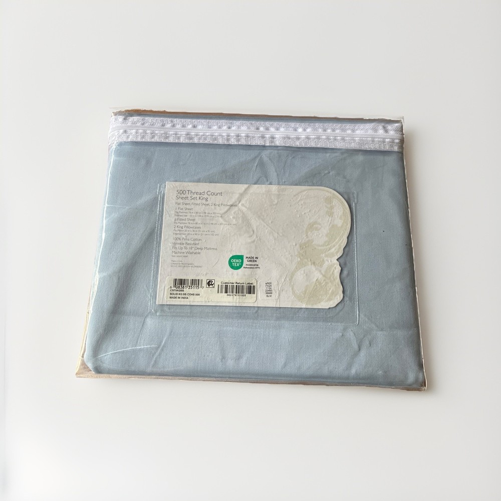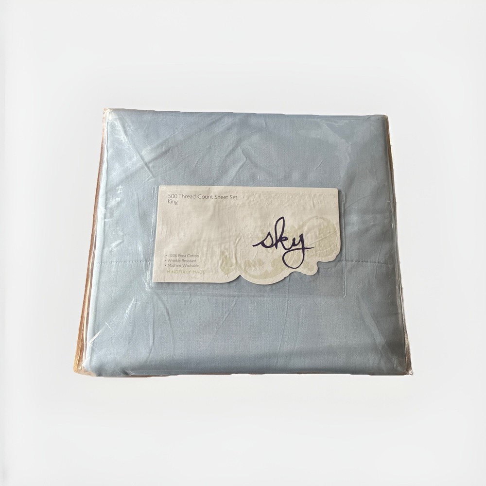 WELCOME TO SHARPOSH CONDITION: NEW WITH TAGS BRAND : SKY THREAD COUNT : 500 COLLECTION: 500TC WRINKLE RESISTANT SIZE: KING COLOR: COAST LIGHT BLUE INCLUDES:KING FLAT SHEET , FITTED SHEET , 2 KING PILLOWCASES MATERIAL: PIMA COTTON MADE IN INDIA KING SHEET SET INCLUDES: Flat Sheet: 108"L x 110"W; Fitted Sheet: 80"L x 78"W x 15"D; Pillowcases (2): 40"L x 20"W