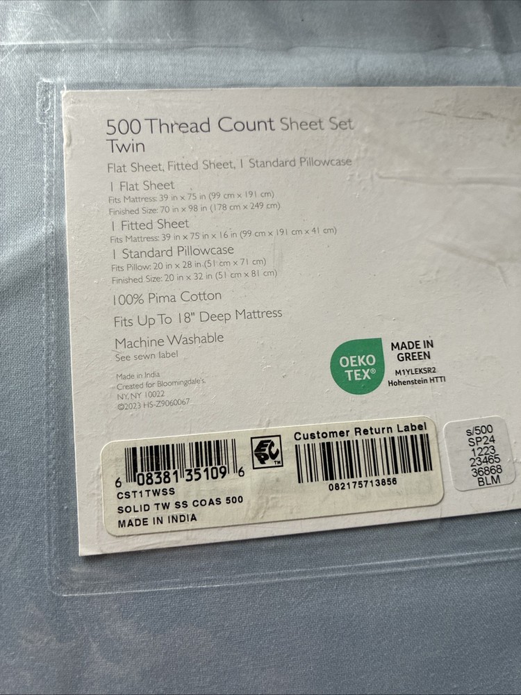 WELCOME TO SHARPOSH CONDITION: NEW WITH TAGS BRAND : SKY THREAD COUNT : 500 COLLECTION: 500TC WRINKLE RESISTANT SIZE: TWIN COLOR: COAST LIGHT BLUE INCLUDES:TWIN FLAT SHEET , FITTED SHEET , 2 STANDARD PILLOWCASES MATERIAL: PIMA COTTON MADE IN INDIA TWIN SHEET SET INCLUDES: Flat Sheet: 98"L x 70"W; Fitted Sheet: 75"L x 39"W x 15"D; Pillowcase: 32"L x 20"W