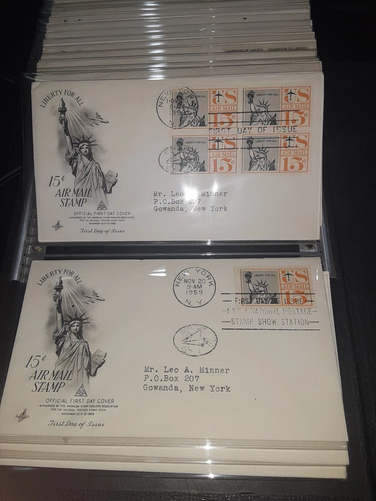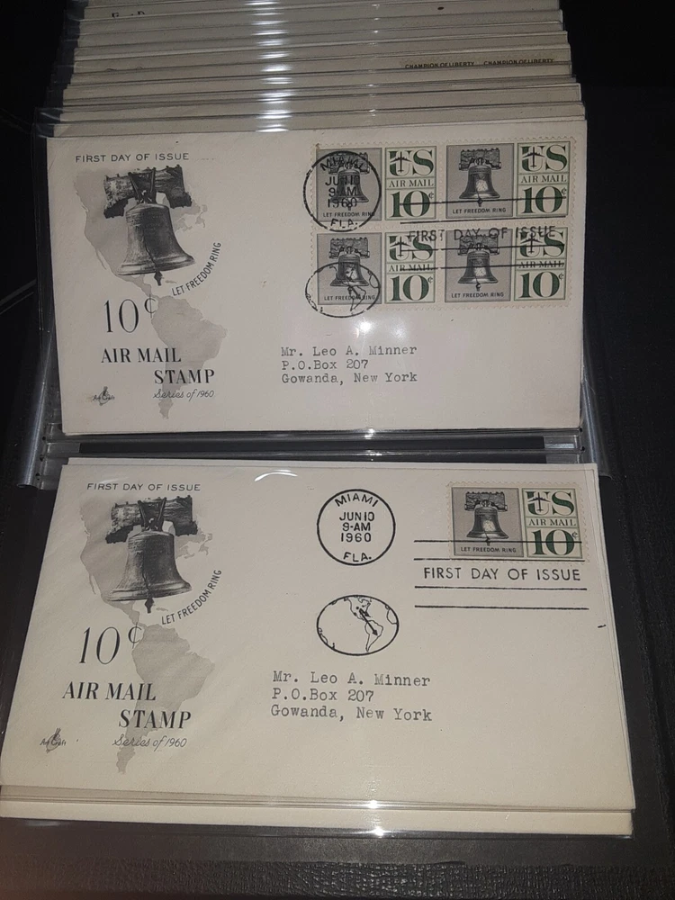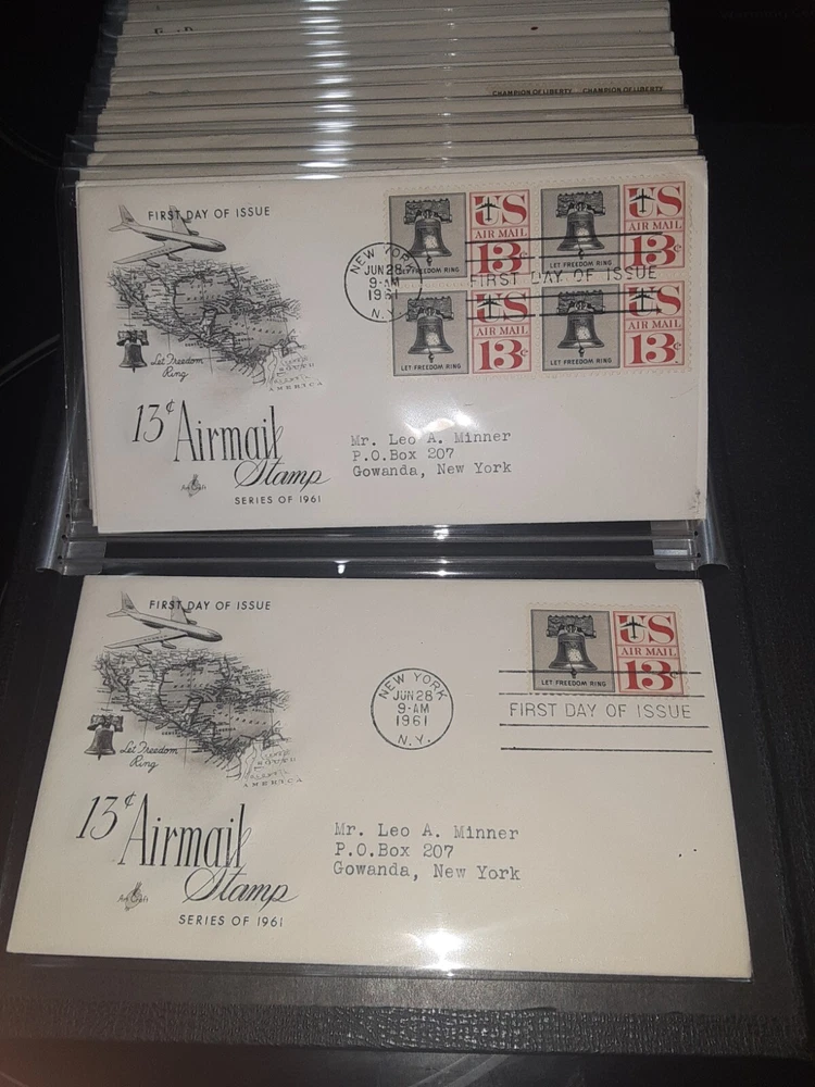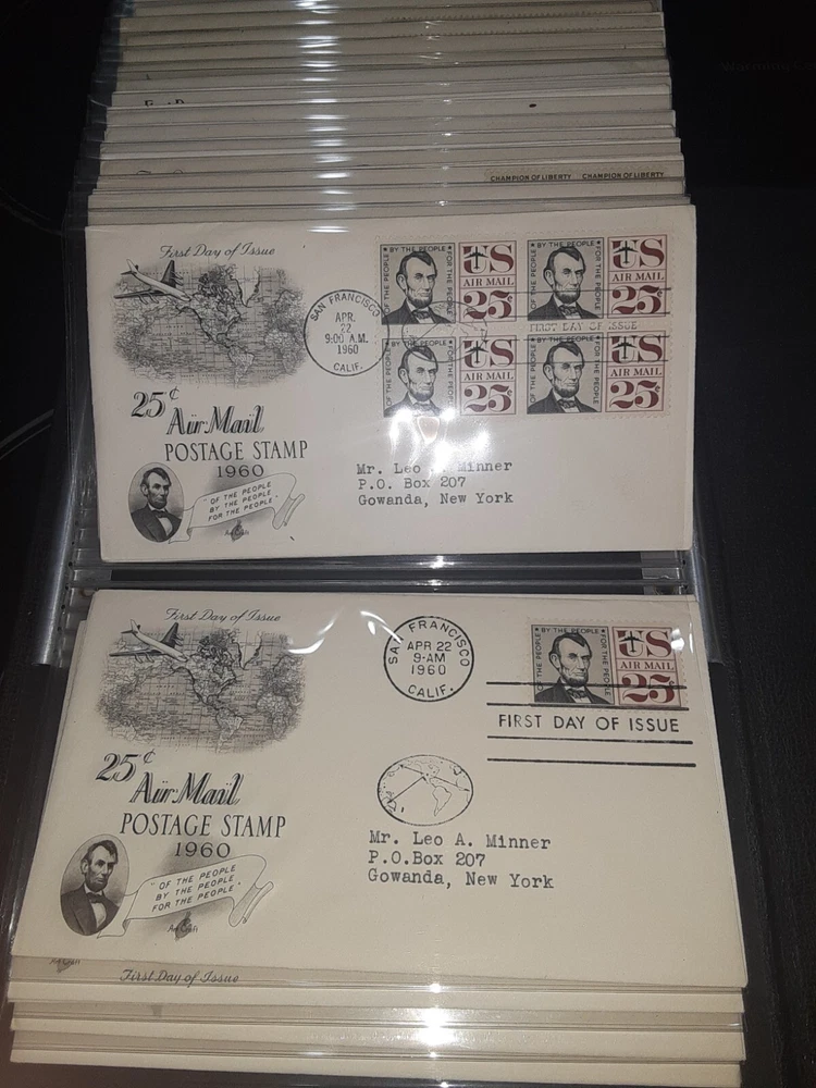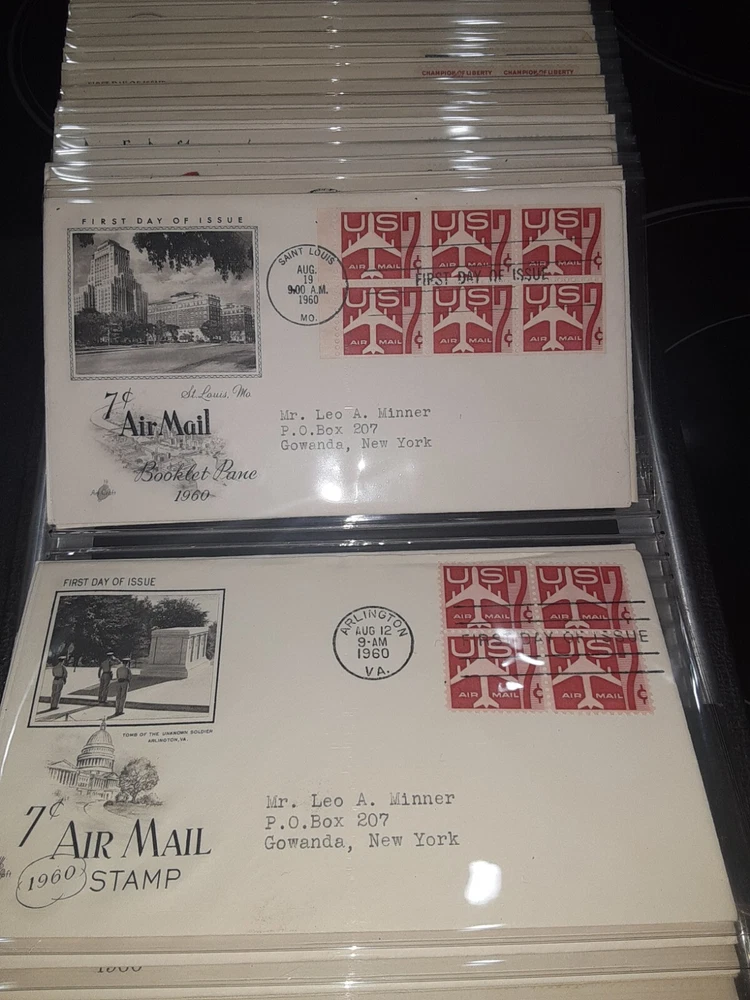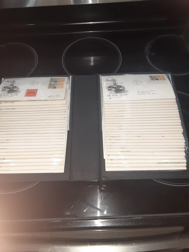 First Day Cover Album is in good condition. Covers are from late 50's and early 60's. Album has a hard cover that it slips into. Album measures Several airmail covers. Album measures 8 x 11.25 x 2.5". 100 covers.