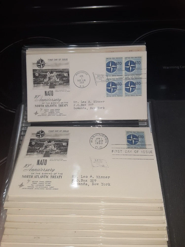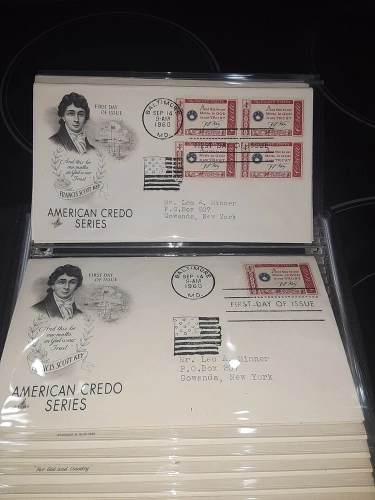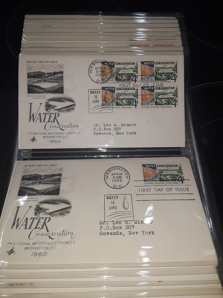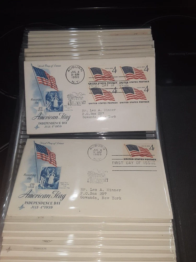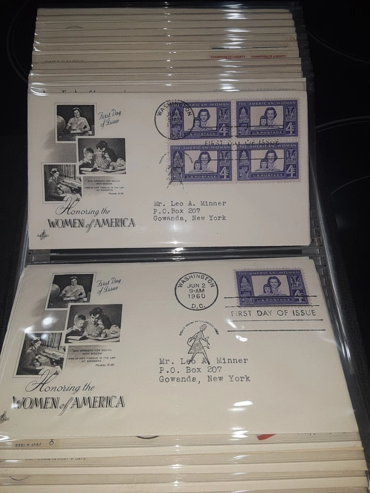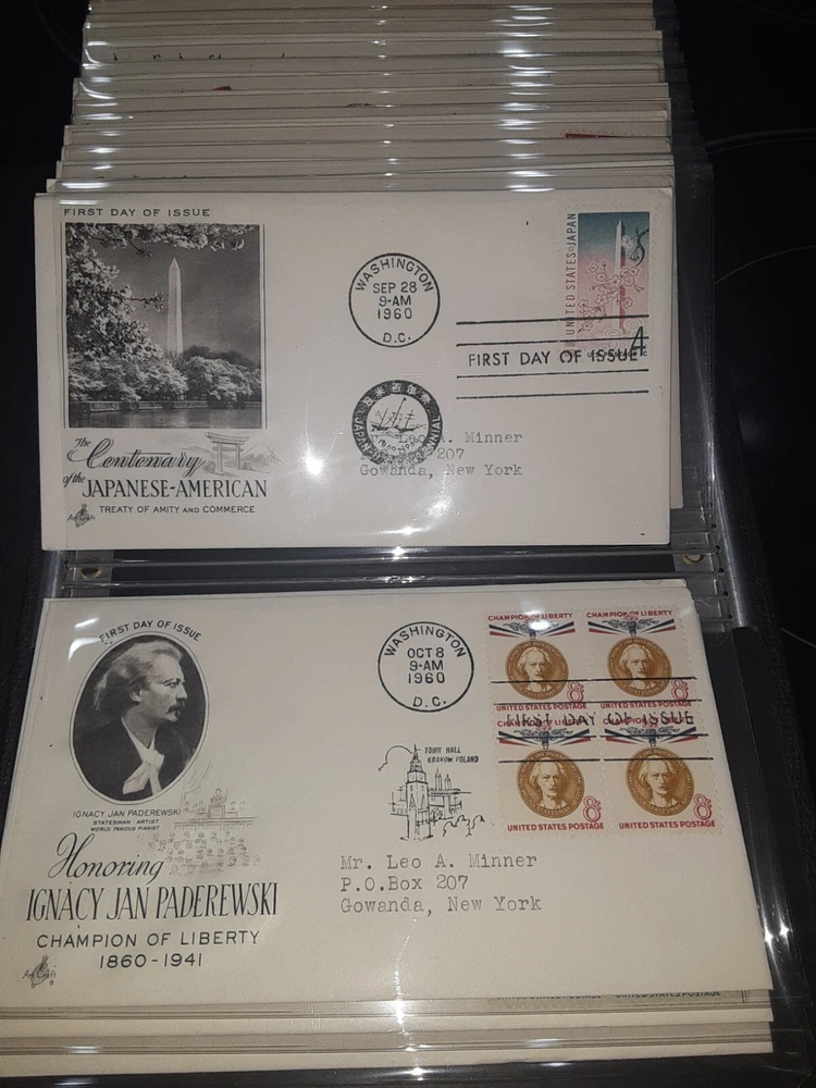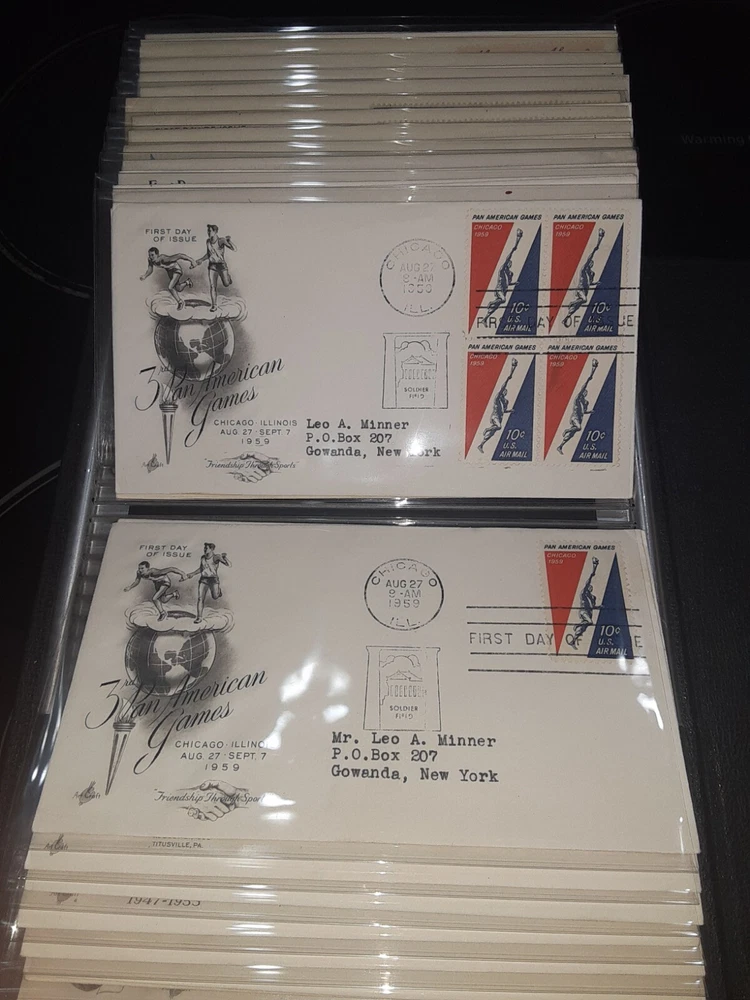First Day Cover Album is in good condition. Covers are from late 50's and early 60's. Album has a hard cover that it slips into. Album measures Several airmail covers. Album measures 8 x 11.25 x 2.5". 100 covers.