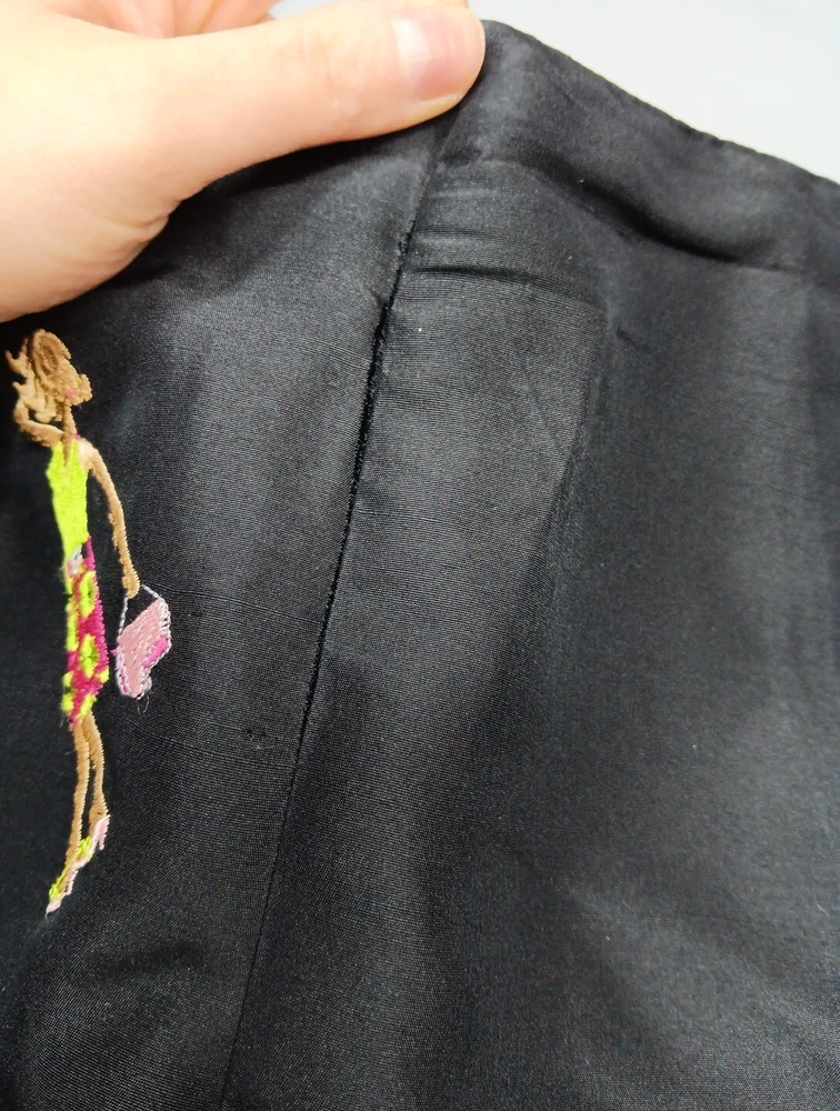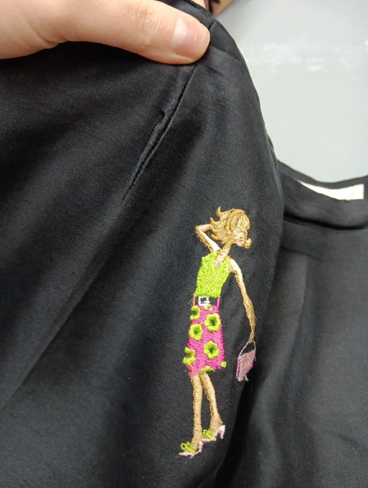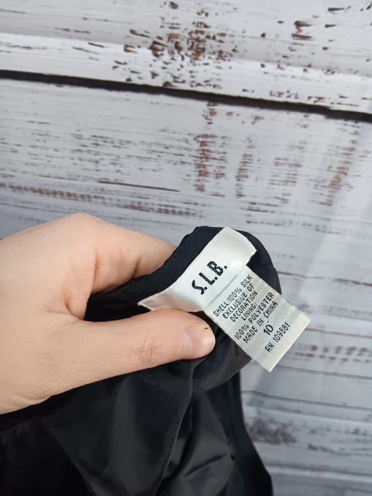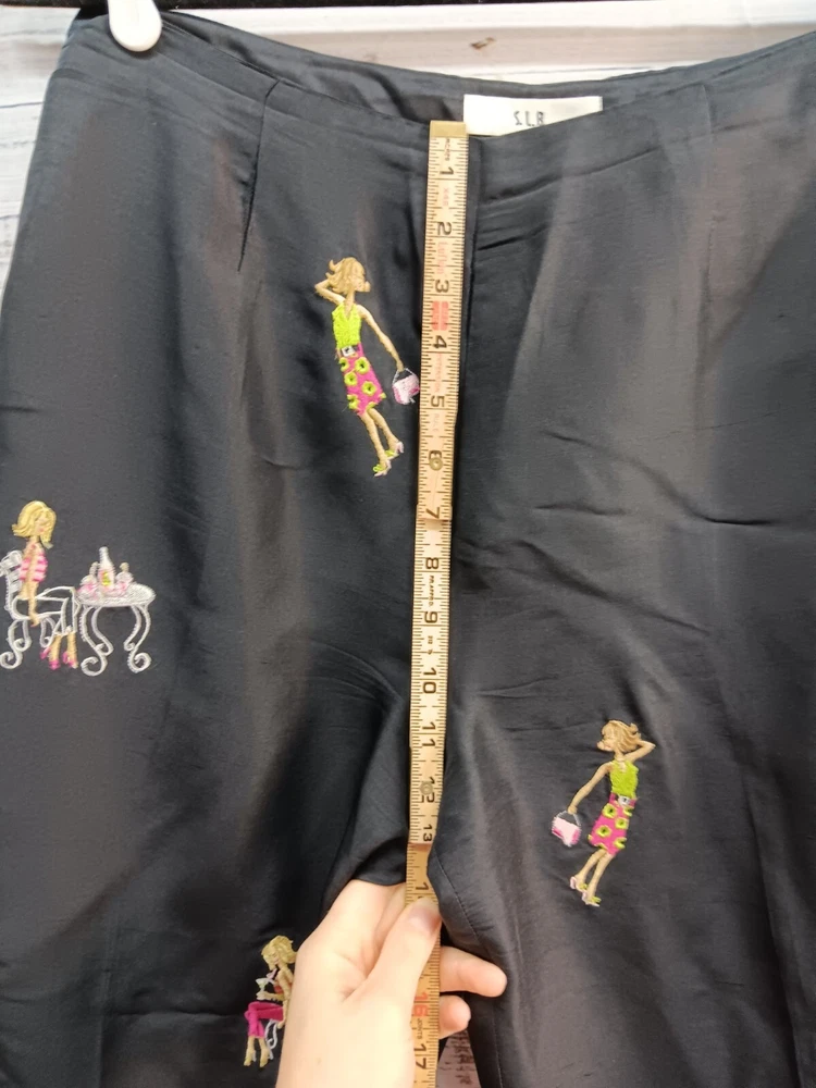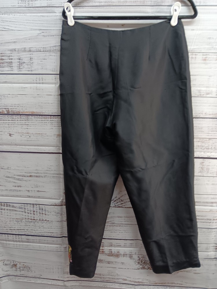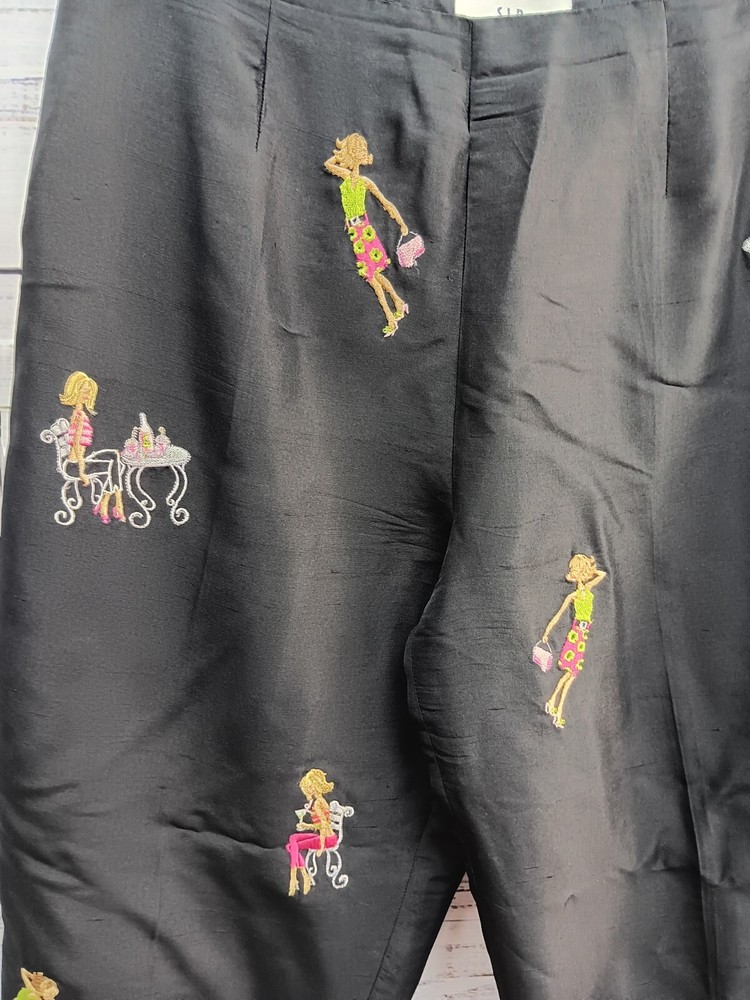 These S.L.B. ankle pants are made for women in size 10, featuring a unique and stylish embroidered design on 100% silk fabric in a classic black color. The pants have a polka dot pattern and are lined for added comfort. With a flat front and a regular fit, these pants are ideal for various occasions including travel, parties, casual wear, and business settings. Perfect for all seasons, these ankle pants offer a bohemian and fun style to elevate any outfit.