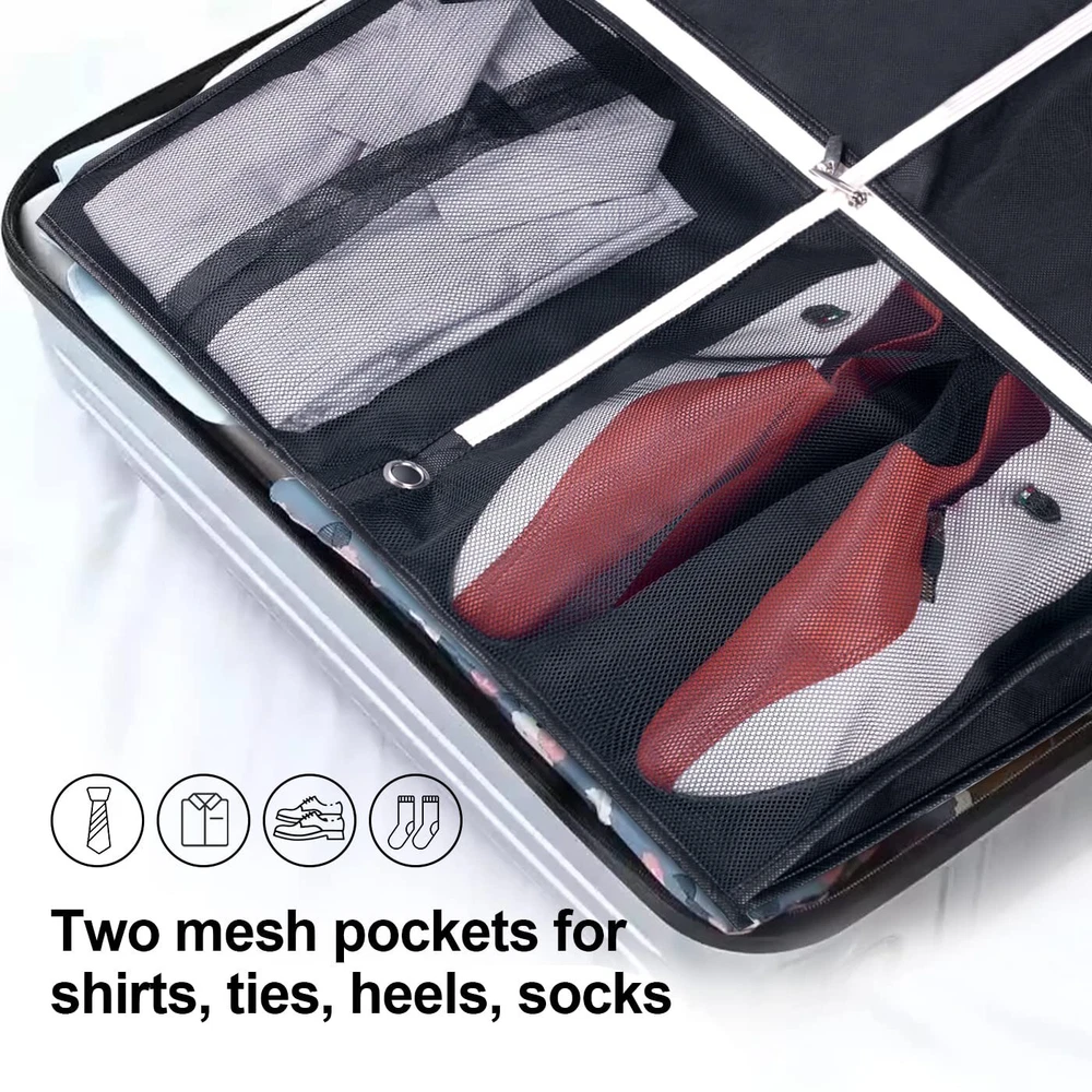 Large Capacity: Dress garment bag comes with 4" gussets, suit for holding 4 men suits or 6 dresses inside there's still room for more, provide more space than others bags and helps keep clothes wrinkle-free. Easy for Travel: Dress cover bag has two handles at both ends, so it can be trifolded and easy to carry without dragging your garments on the ground, suit for travel and bussiness trip. Extra Space: Two mesh pockets provide more space to store shoes, shirts, tie, socks, underwear, hanging clothes bag for travel helps save your time when search the matched accessories. Easy to Access: There is a clear plastic window makes it a breeze to find the clothing you want without having to zip open the garment bags for hanging clothes travel, zipper works smoothly without snags and the small hole at the top of the bag comes in handy. Versatile Usage: Garmet traveler bag measured by 60" x 24" x 4", great size for dress, gown, garment, coat, sweaters, outfit, shirts, jackets, tuxedos and military uniform, not only for travel but suitable for home storage.