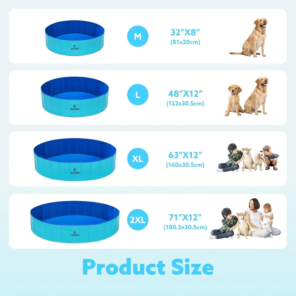 SLOOSH Foldable Dog Kiddie Pool - Portable Hard Plastic Doggie Swimming Pool, Anti-Slip Collapsible Pets Bath Tub Suitable for Kids Indoor Outdoor Backyard Use (63" x 12", Blue) Item Description About this item Durable and Safe Material: Made from high-density fiberboard and premium PVC, our pool is sturdy and resistant to wear. The non-slip bottom ensures your pet’s safety while playing Multiple Sizes Available: Choose from various sizes to suit pets of all breeds. Ideal for small, medium, and large dogs, as well as kids Easy to Set Up and Use: No need for an air pump—just unfold, fill with water, and it’s ready. A convenient drain valve allows quick and easy water release Foldable and Portable: This collapsible design makes it easy to store and carry. Perfect for home, travel, or camping trips with your pet Versatile Use: Ideal as a pet pool, kiddie pool, ball pit, or whelping box. Suitable for indoor and outdoor use, providing fun for both pets and children › See more product details Durable and Safe Material: Made from high-density fiberboard and premium PVC, our pool is sturdy and resistant to wear. The non-slip bottom ensures your pet’s safety while playing Multiple Sizes Available: Choose from various sizes to suit pets of all breeds. Ideal for small, medium, and large dogs, as well as kids Easy to Set Up and Use: No need for an air pump—just unfold, fill with water, and it’s ready. A convenient drain valve allows quick and easy water release Foldable and Portable: This collapsible design makes it easy to store and carry. Perfect for home, travel, or camping trips with your pet Versatile Use: Ideal as a pet pool, kiddie pool, ball pit, or whelping box. Suitable for indoor and outdoor use, providing fun for both pets and children Payment We accept payment only through PAYPAL Shipping We ship products worldwide through standard express courier service, it will reach within 7 to 10 days to abroad buyers, we ship the product after recieved clear payment and give full information about shipment to the buyer Return We accept product return within 7 to 21 days from delivery date but product should be in original position and not in damaged condition,the return shipping charges will be buyer responsibility