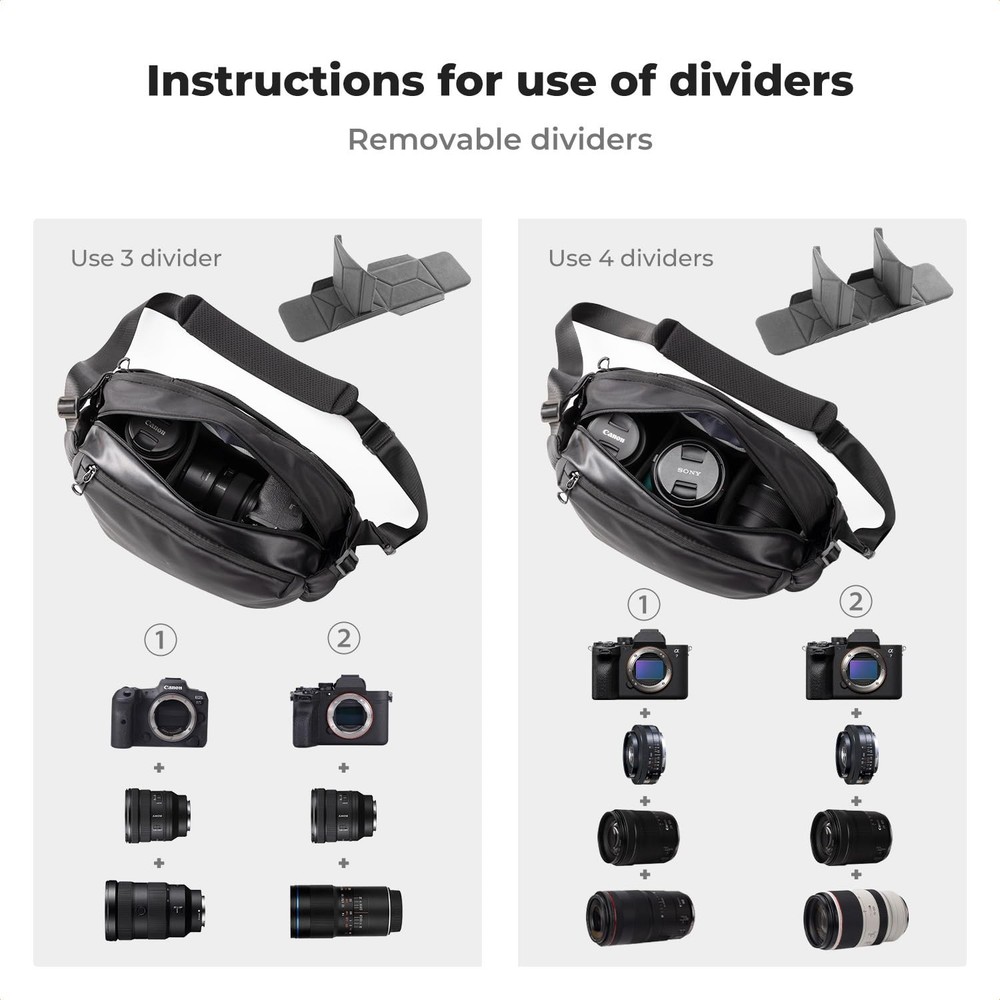 【Upgrade Version & Large Capacity 】Max Capacity:12L. External Size:14.6"*6.7"*9.8"; Internal Size:13"L*4.7"W*9.45"H.The camera sling bag main compartment for 1 DSLR/SLR/Mirrorless and 2-4 exchange lenses. (Note: You will receive a camera bag, the tripod is not included.) 【Removable Individual Dividers】This camera bag Comes with 4 individual removable dividers give brilliantly customizable and protective internal organization while allowing maximal use of the available space. you can adjust the space at will according to your camera equipment. 【Camera Protection】External material are abrasion-resistant thread, Splash-proof. The camera shoulder bag is padded with thickened foam around the bag and lined with soft velvet to protect camera gear from bumps and shocks, effectively protects equipment in all directions. 【Upgrade Multiple Storage Pockets】In addition to the main compartment, the exterior of this camera case features 1 front zipper pocket with built-in batteries Insert Pouch, Filter Insert Pouch, mesh pocket to organize batteries, filter,and other accessories. 2 side pockets for carrying an umbrella or small water bottle. 1 back small zipper pocket for organizing powerbank, phone, etc.1 back large zipper pocket for up to 13" ipad. 【User-friendly Design】The SLR/DSLR Camera bag Soft Padded shoulder strap varied from 39.3 to maximum 57.4 inch can be adjusted personal preference. Bottom external carry straps allow camera tripods to be attached to the underside of the bag. 【Simple and Stylish】It can be a camera bag for photographers, or as an everyday shoulder bag or fanny pack when the dividers is removed.An ideal gifts for friends,family. Any problem, contact for help.